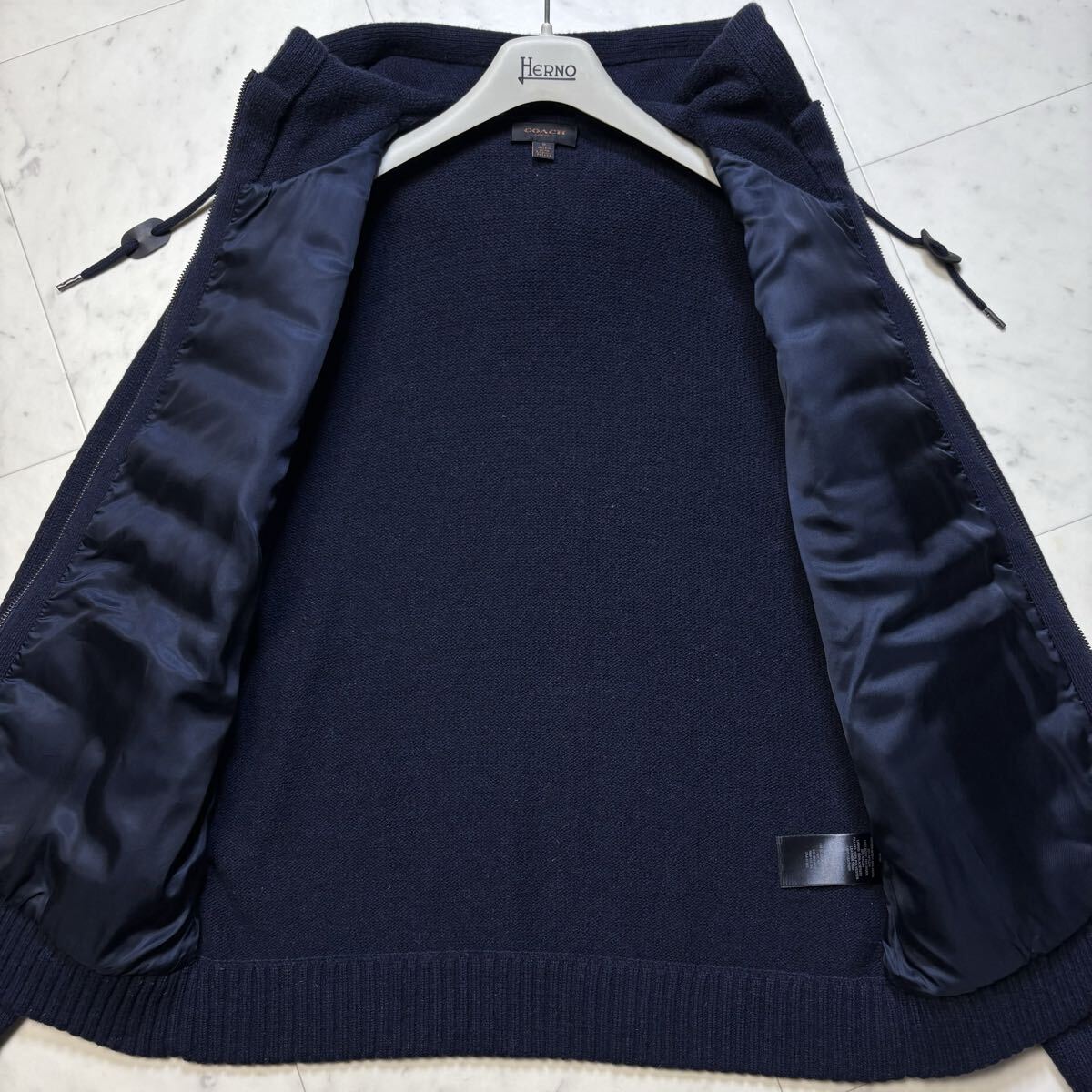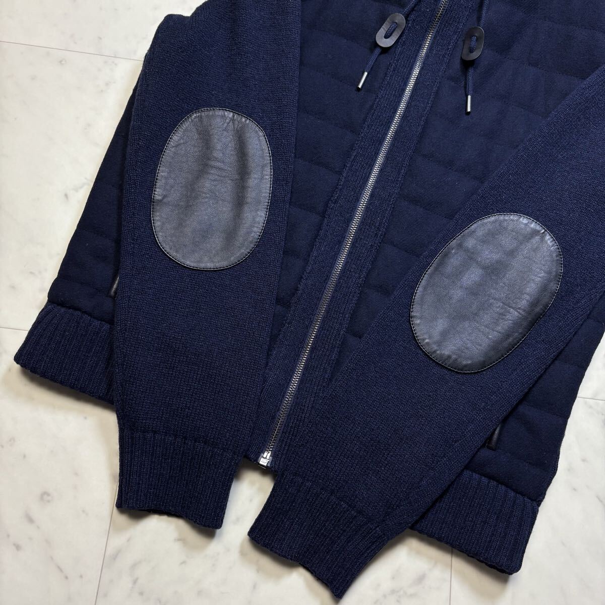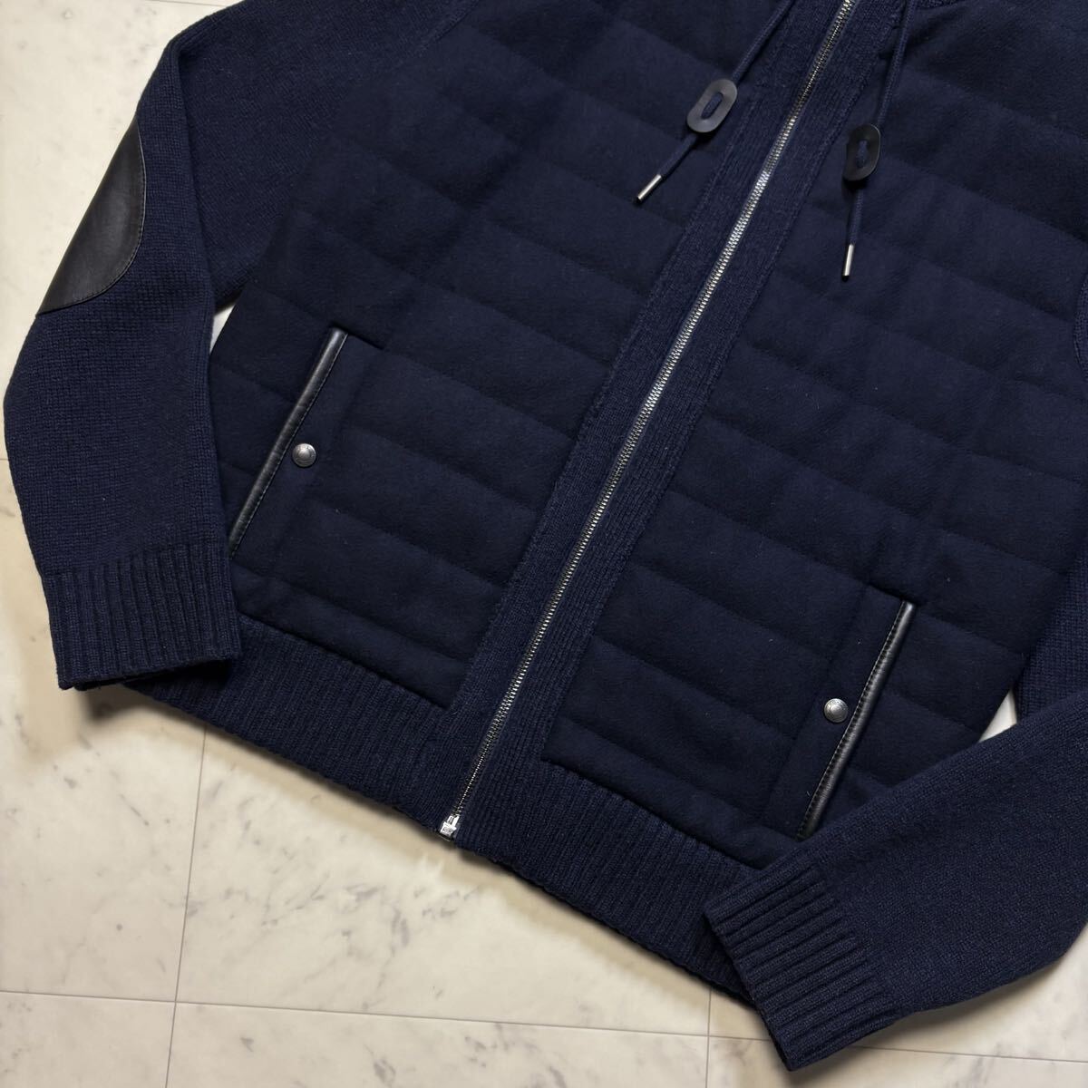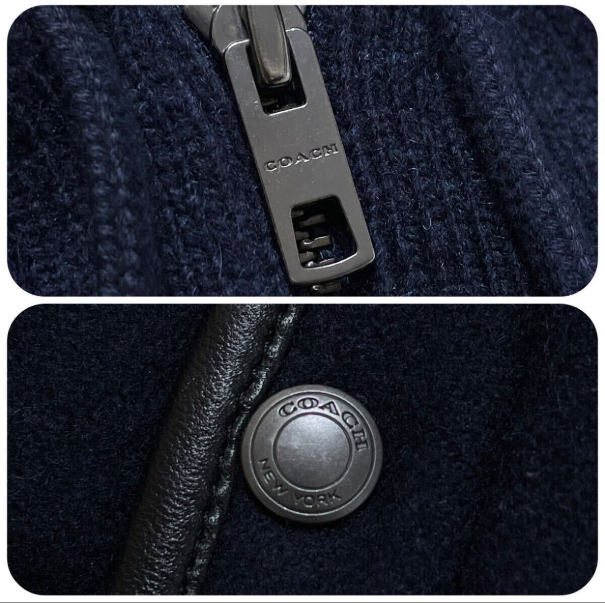 美品/L相当★ コーチ COACH ニット切替 中綿 ダウンジャケット ジップ パーカー ブルゾン ラムレザーエルボーパッチ ウール ネイビー 紺
