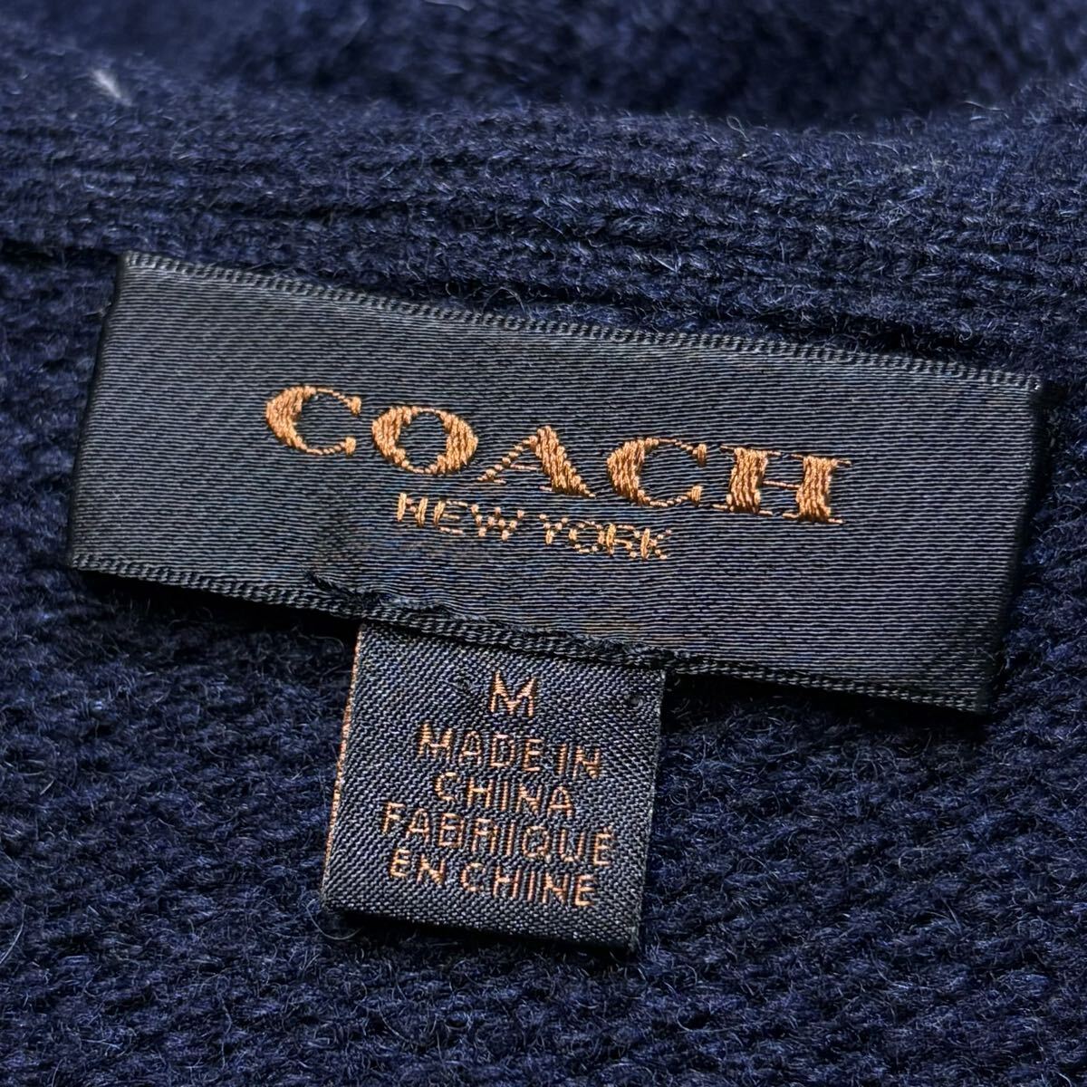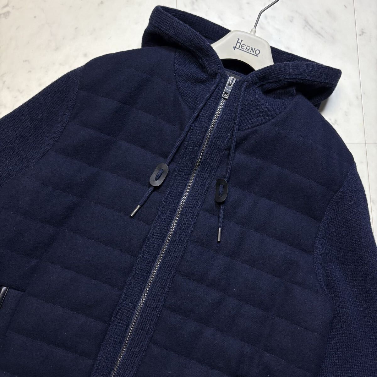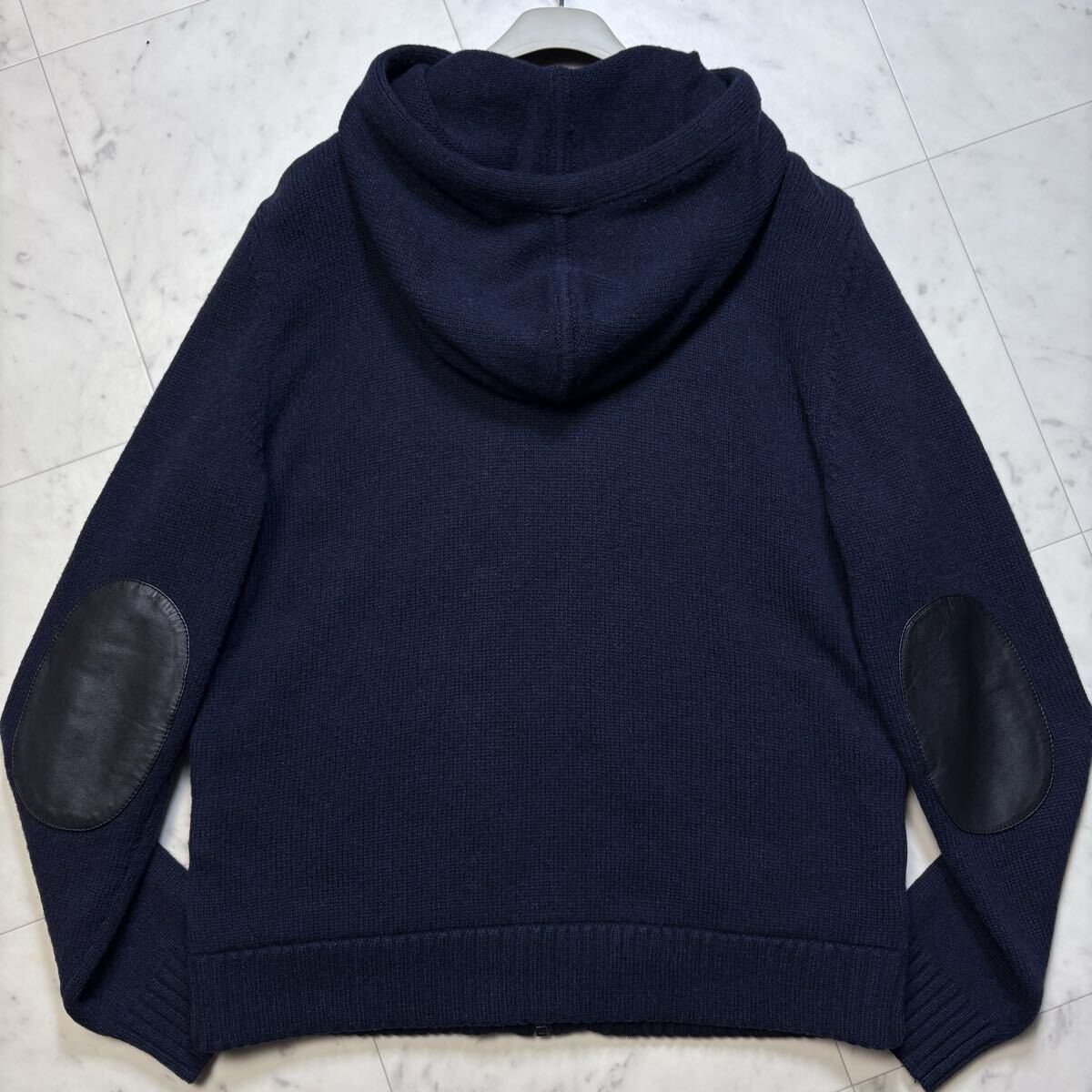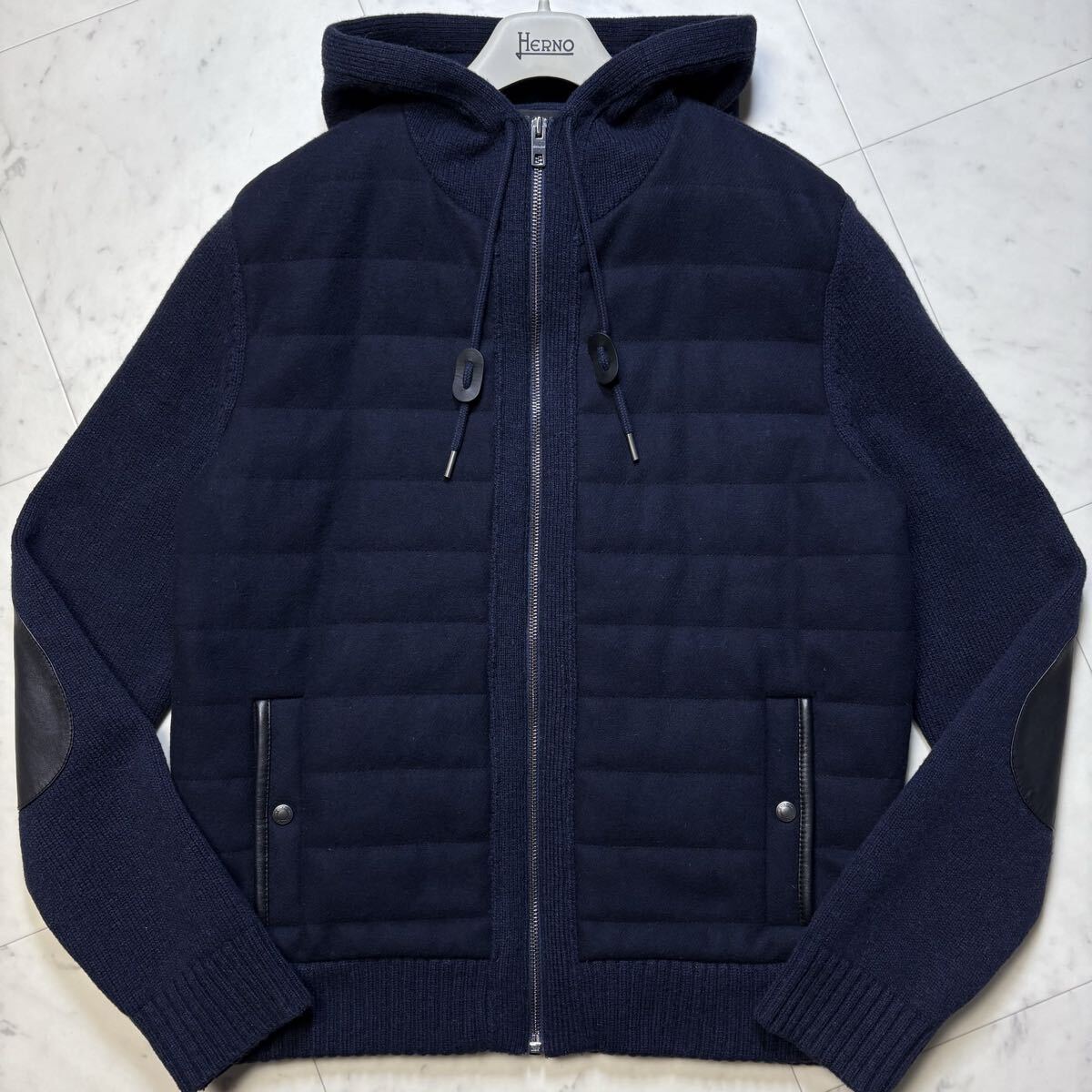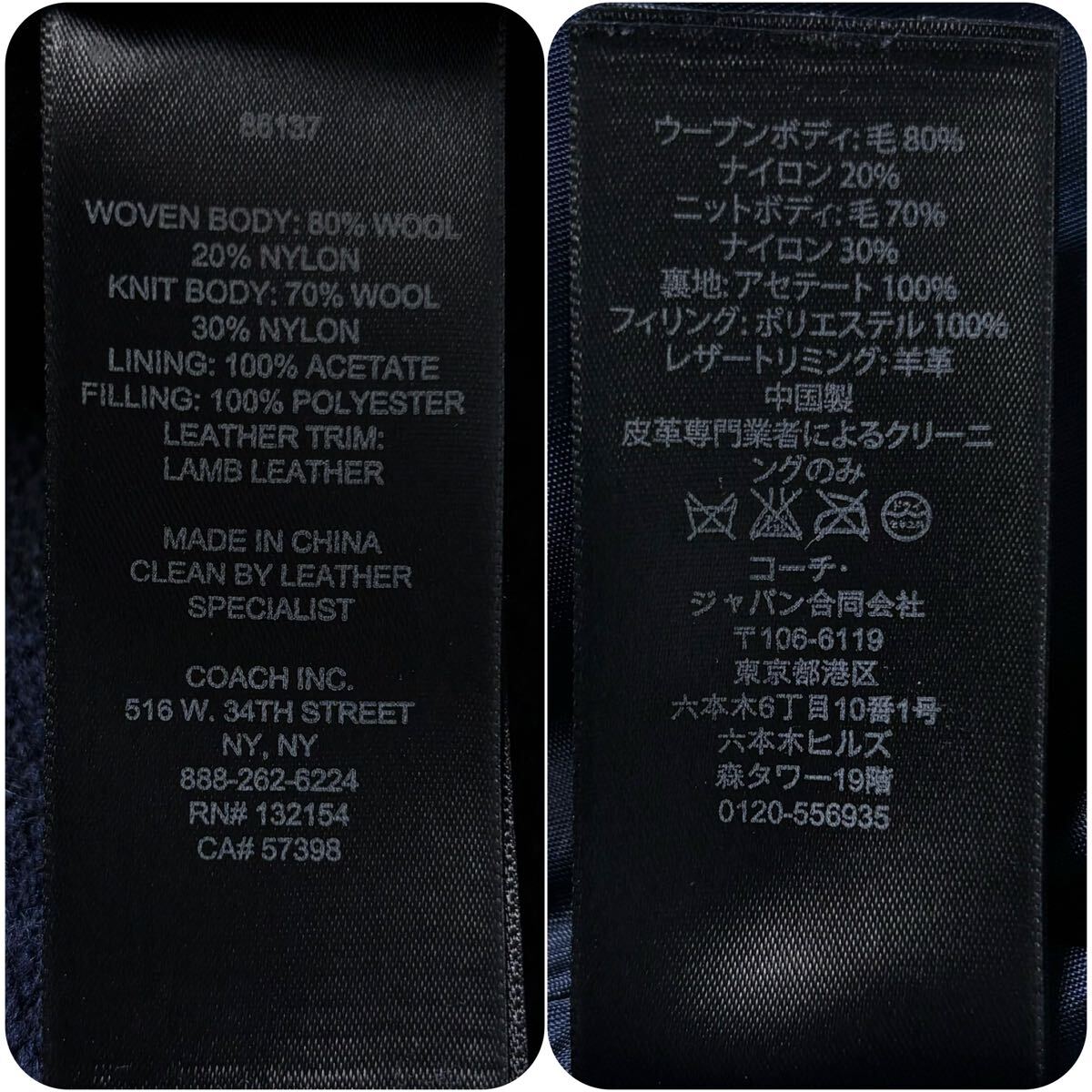 美品/L相当★ コーチ COACH ニット切替 中綿 ダウンジャケット ジップ パーカー ブルゾン ラムレザーエルボーパッチ ウール ネイビー 紺