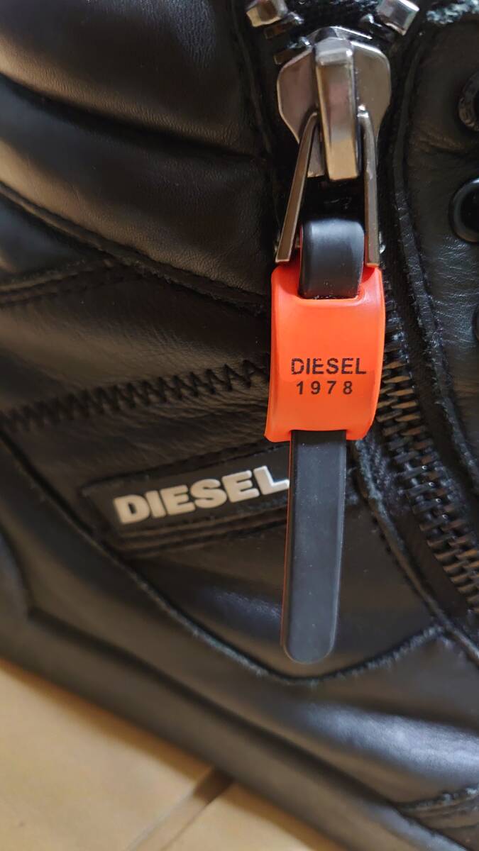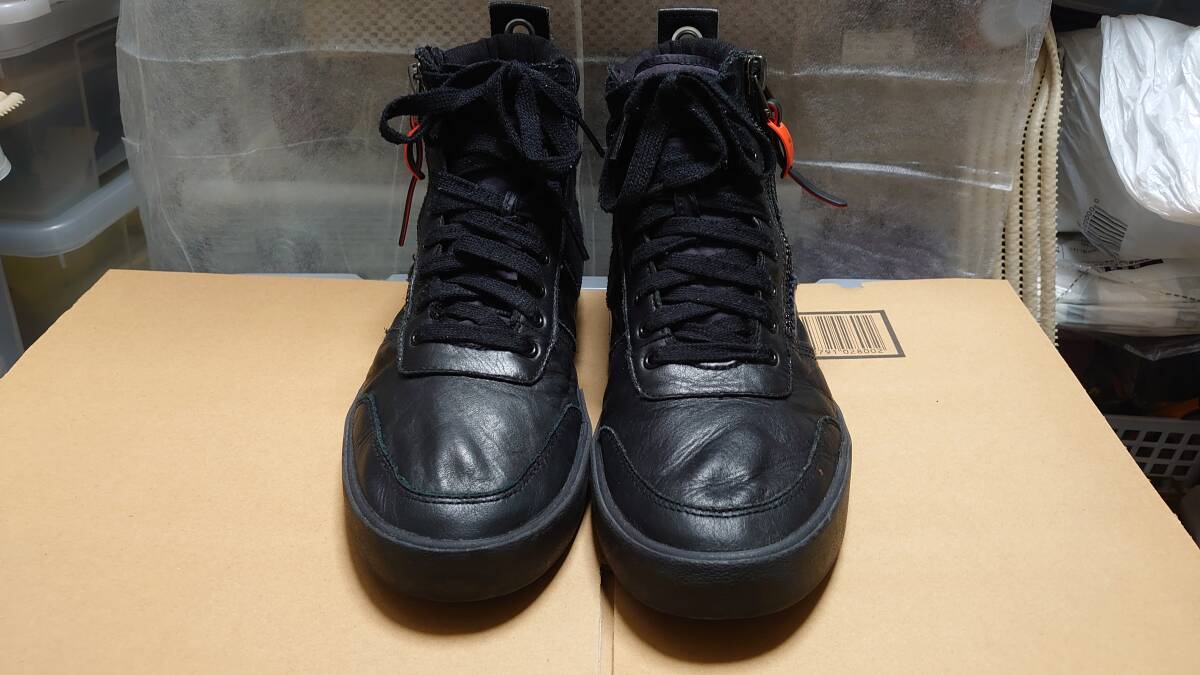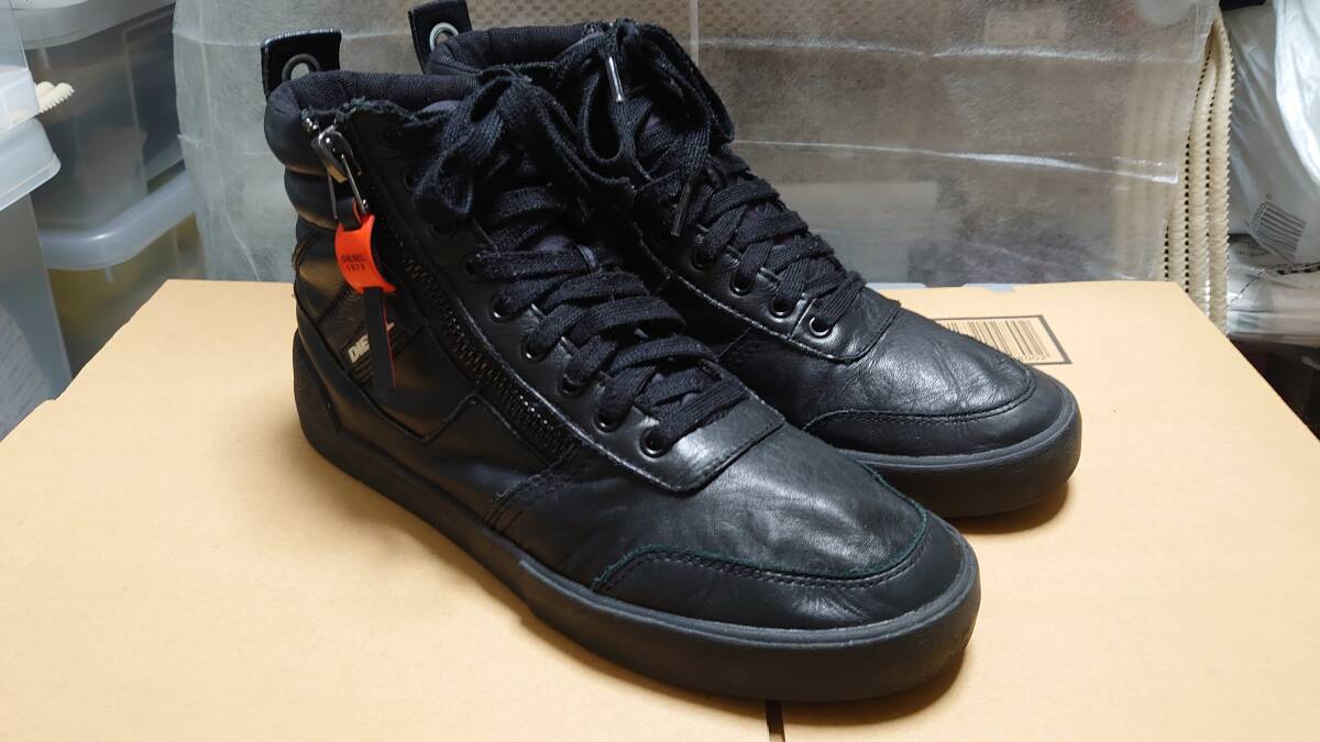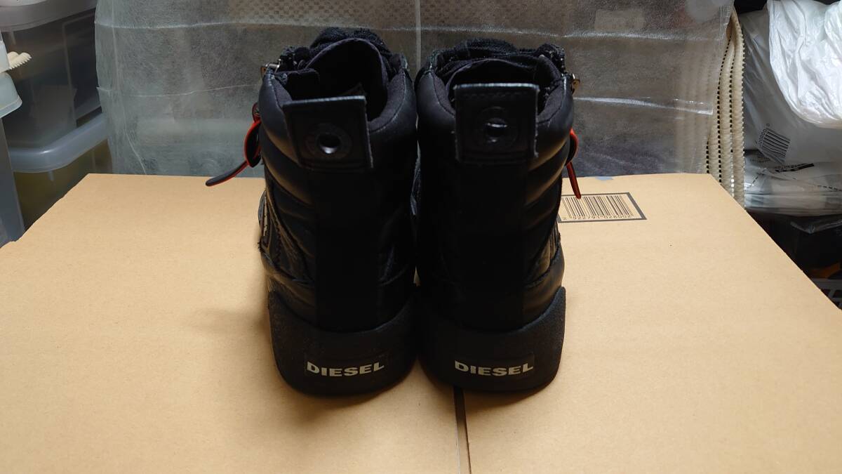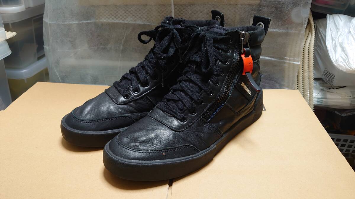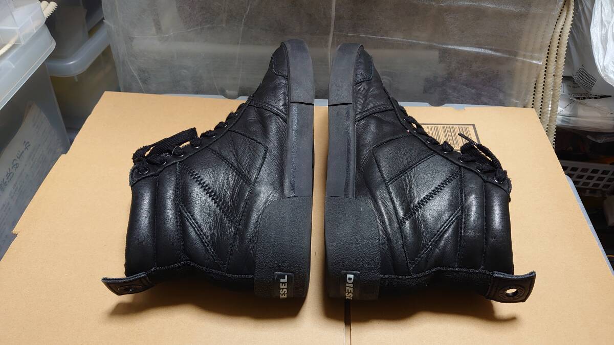 ブランドシューズ等大処分:DIESEL・ディーゼル本革ハイカットシューズ・size27.0cm・美品です。サイズは27.0cmと記載がありましたが、メジャーによる簡易計測では、アウトソール29.0cm、甲幅10.0cmとなっています。全体的な状態は、使用にともなううす汚れ等はありますが、比較的程度の良い商品だと思います。但し、あくまでも素人による簡易検品ですので、画像優先でご判断ください。また、撮影時に目視でキズ汚れ等のチェックを行いましたが、特に特筆するような大きな問題は見つかりませんでした。あくまで中古品ですので見落とした傷や汚れ・型崩れ等があるかもしれないということをご理解の上、細かいことを気にする神経質な方は、ご入札をお控えになってください。また、格安スタートで販売する商品だということを認識していただき、3Nでお願いいたします。発送は、定形外郵便の1kg未満(¥920)もしくは、宅急便80サイズにて発送いたします。 ≪取引案内≫ 新規の方、悪い評価が10%以上ある方の、入札はお断りしております。特に最近、新規のIDで落札し、一切連絡が取れない方が増えてきています。ご落札後24時間以内に、取引ナビにて連絡を取れる方で、落札後、1週間以内にご決済のできる方のみの入札をお願いいたします。 ≪発送について≫ 中古品(特に機械。電化製品等)は代替え品がないため、梱包作業に時間をかけていますので、入金確認後、翌々日の発送になってしまうこともありますので、ご了承ください。また、その他の商品に関しても、梱包に時間をかけていますので、入金確認後の翌日から翌々日の発送になることがありますので宜しくお願い致します。 ≪返品値引き≫ 中古商品・アウトレット商品に関しては、画像、文章ではお伝えできないことが多く、また、運送中の衝撃により、動作上の不具合も出る可能性がありますので、その点も踏まえてのご入札をお願いいたします。よって、いかなる理由においても返品・値引き等の対応は出来ませんので宜しくお願い致します。