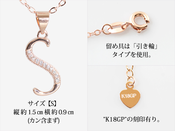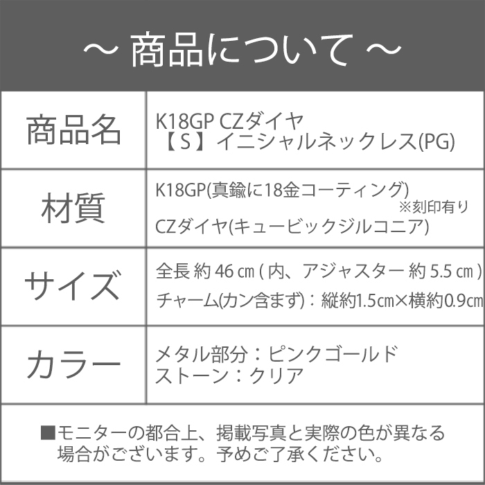 S/イニシャル/ネックレス/新品/K18GP/ピンクゴールド/レディース/18金/チェーン/アルファベット/英語/頭文字/CZ/ダイヤ/PG