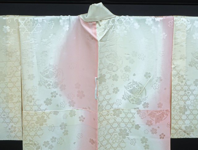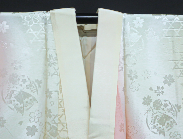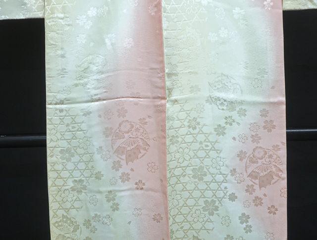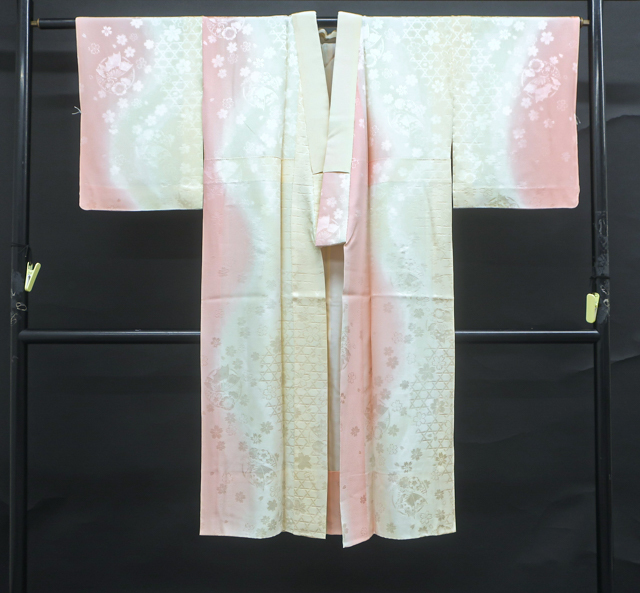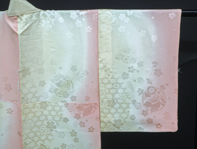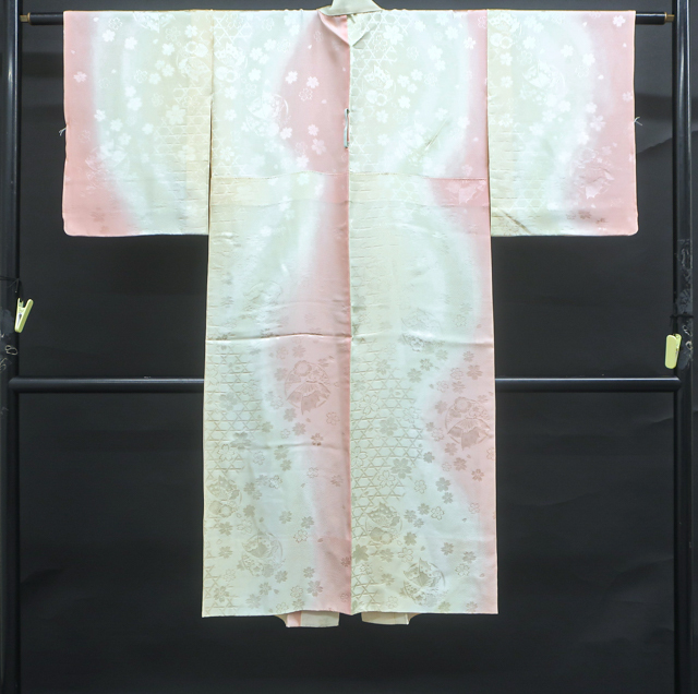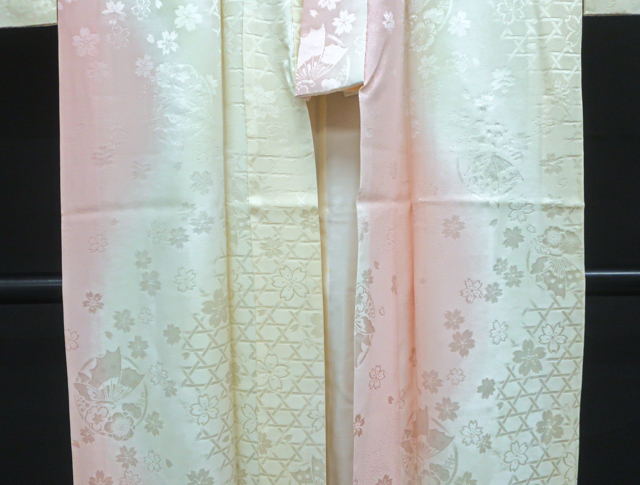 リサイクル商品のため、裏地に汚れ、衿にシミがございますが着用可能なお品です。 地色は、薄黄色×薄ピンクです。 1枚目の画像が近いお色かと思われます。 素材は正絹です。 |