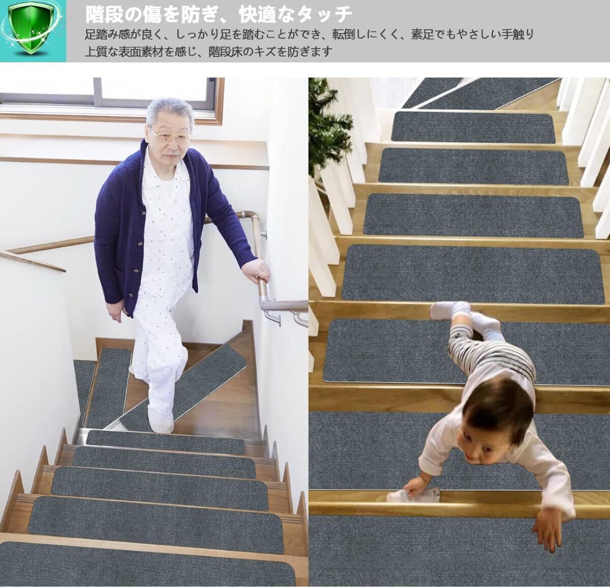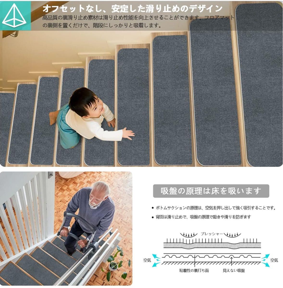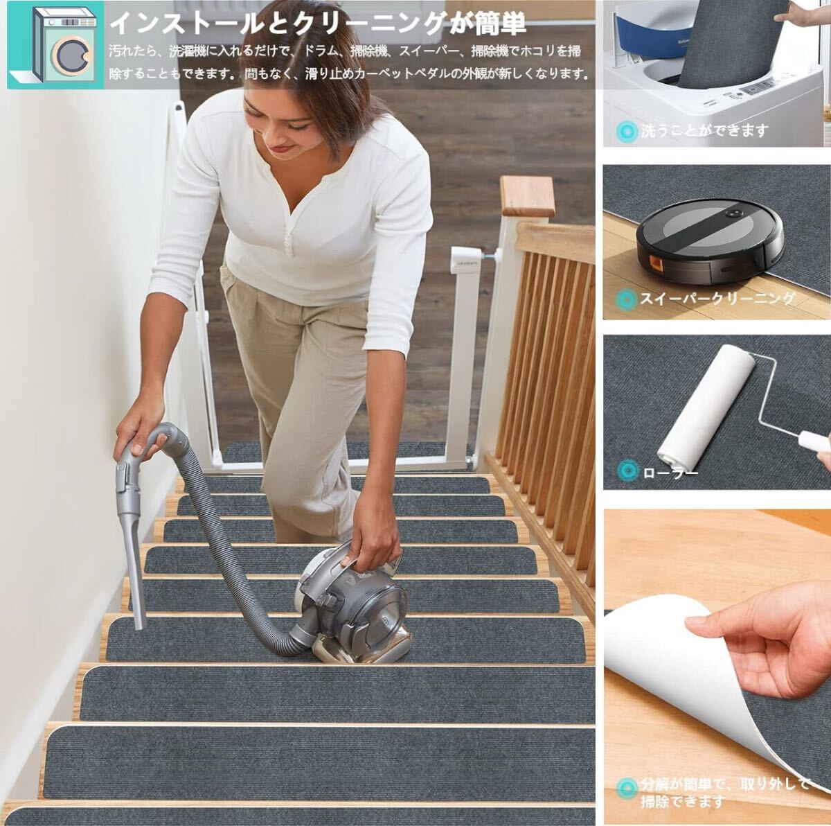 吸着タイプで簡単に設置でき、貼り直しも可能。階段を掃除した後に貼り付けるだけでしっかり固定されます。使用後も跡が残らず、取り外しやすい仕様です。