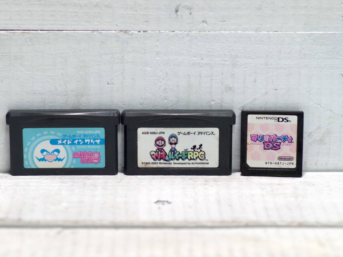 こちらメイドインワリオ、マリオ&ルイージRPG、マリオパーティDSのセットです。商品は画像に写っているものが全てです。古い端子型ソフトはメンテナンスをしないとほぼ接触不良で動作しません。清掃用アルコールは購入すると高いので、端子を清掃し、プレイ可能と記されたものを購入されることをおすすめします。
