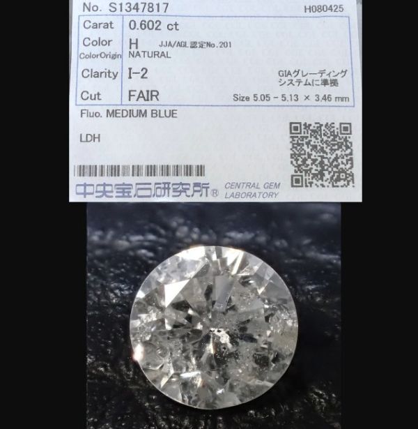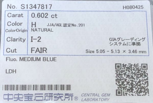 天然 ダイヤモンド ルース 0.602ct H I-2 FAIR MEDIUM BLUE 裸石 中央宝石研究所ソーティング付 #9