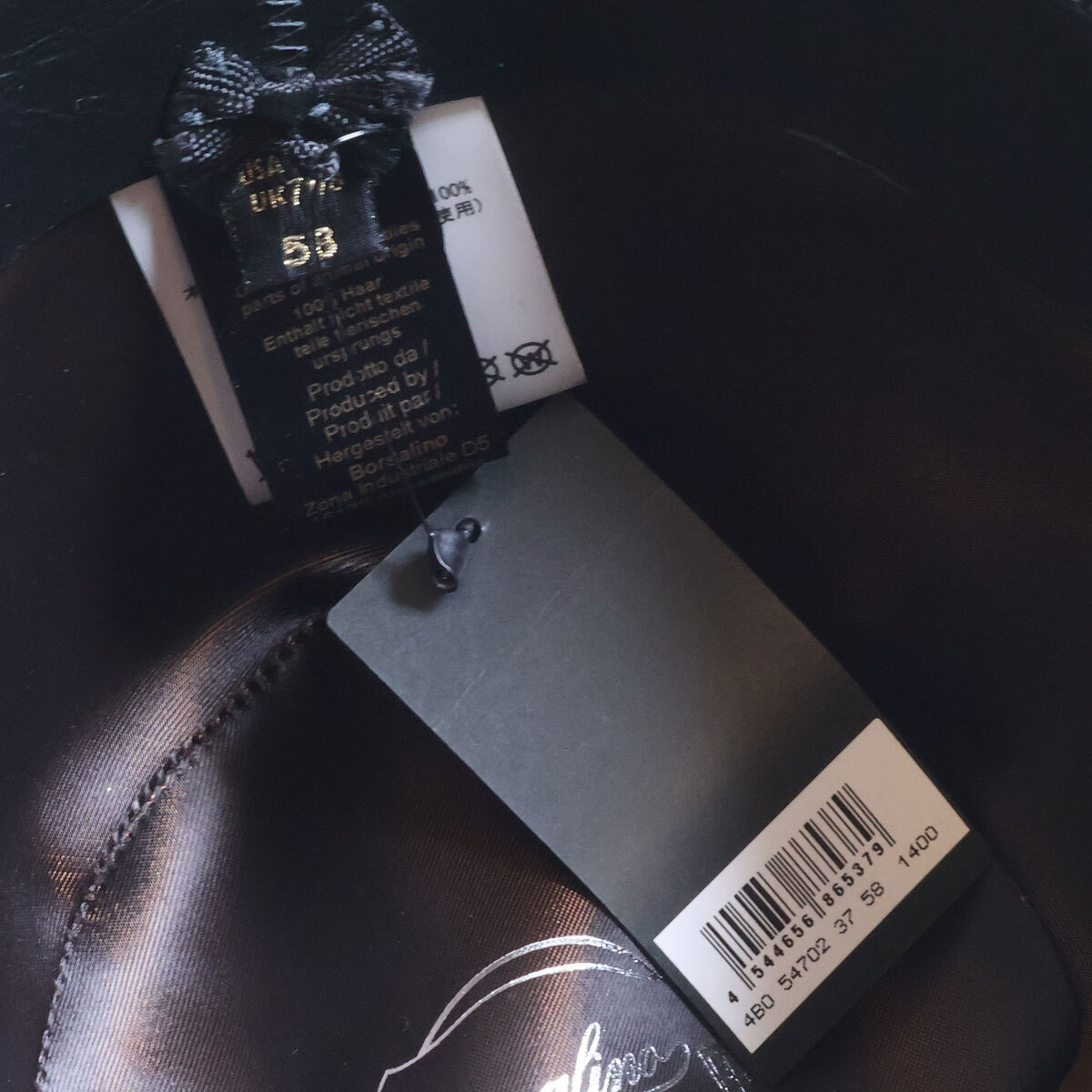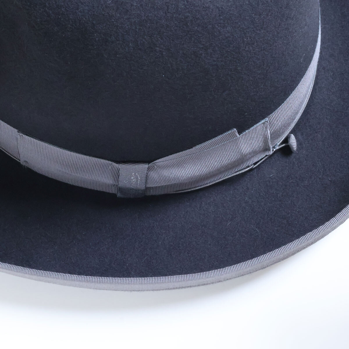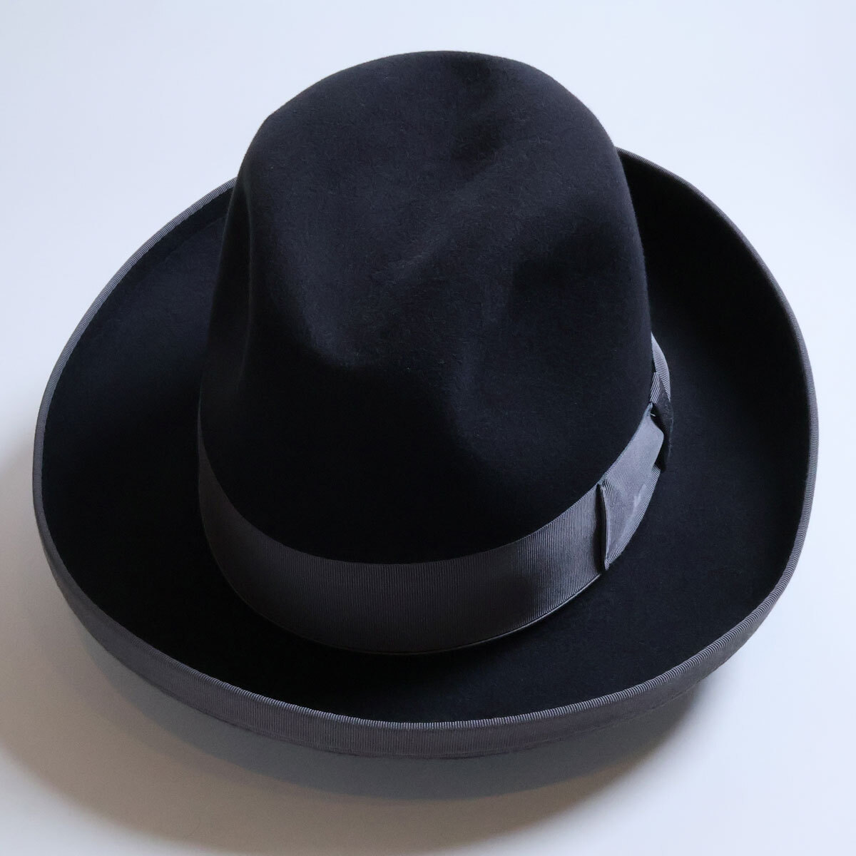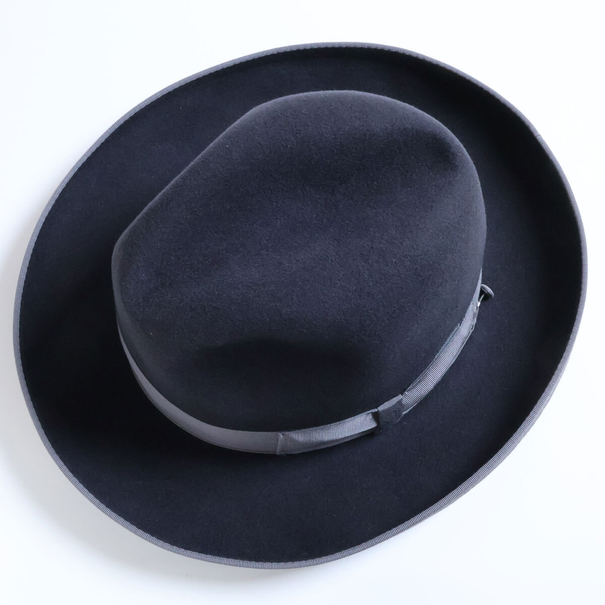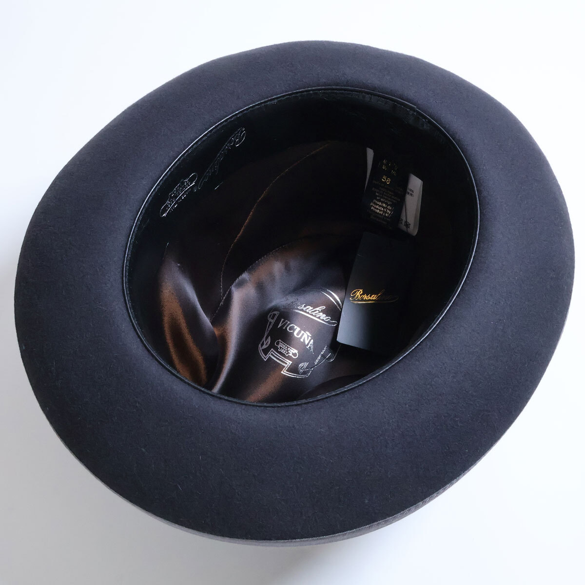 ボルサリーノ イタリア製 最高級中折れ帽子 ボルサリーノは、1875年創業、イタリアの老舗帽子ブランドです。 また、その名は、紳士帽の代名詞としても語り継がれています。 150年を経た今日でも、今世紀初頭の機械&木型を使った熟練職人による手作りで製造されています。 繊維の宝石とも呼ばれるビキューナの毛を、絶妙な配合バランスでラビットファーと合わせ、 しなかやかできめの細かいフェルトに仕上げられた極上の逸品です。 ウインドキャッチャーが付属されているのも特徴的です。 強風の際に細紐をほどき、ジャケットのフラワーホールに留めて使うもので、 高級な帽子にだけ備わる機能的なディテールです。 モデル:ホンブルグ ビキューナ ミドルブリム 本体カラー:ブラック リボンカラー:グレー 表記サイズ:58 実寸サイズ:頭周り内寸約57.5㎝、ブリム(ツバ幅)6.5cm、クラウン高さ13㎝、リボン幅4cm 素材:毛(ビキューナ)100%、裏地のスベリは本革 定価:154,000円 |
