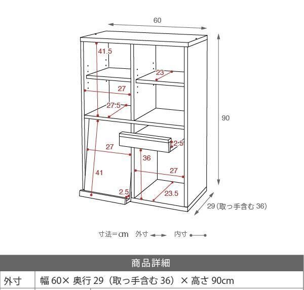 【カラー】 ホワイト、ナチュラル 【サイズ】 <外寸> 幅60×奥行29(取っ手含む36)×高さ90cm <内寸> オープン部:幅27×奥行27.5×高さ41.5cm 扉内:幅27×奥行23.5×高さ41.5(有効36)cm 飾り棚:幅27×奥行2.5×高さ41cm 可動棚:幅27×奥行23×厚み1.8cm(3.2cmピッチ5穴) 【材質】 本体:プリント紙化粧合板 【生産国】 ベトナム 【梱包】 サイズ:97.2×33.6×15.1cm、重量:30.2kg 【その他】 可動棚:2枚 【組み立て品】 お客様による組み立てが必要です。 |