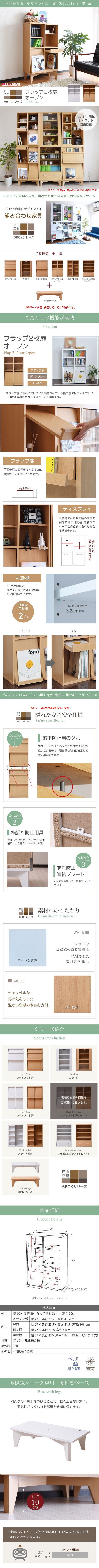 6種類のボックスを自在に組み合わせてオリジナルの壁面収納をつくれる6BOXシリーズ。 リビングに最適。前面のフラップ扉には雑誌がディスプレイできます。 扉内には雑誌のバックナンバー等収納して。 オープン部融合タイプなので、用途はさまざまです。 |