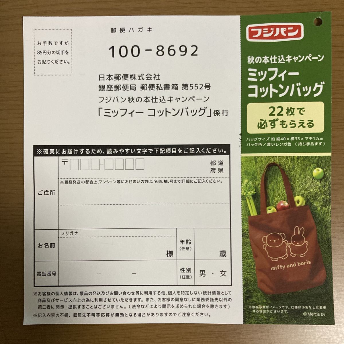 フジパン 秋の本仕込キャンペーン「ミッフィーコットンバッグ 」応募券12枚 送料85円