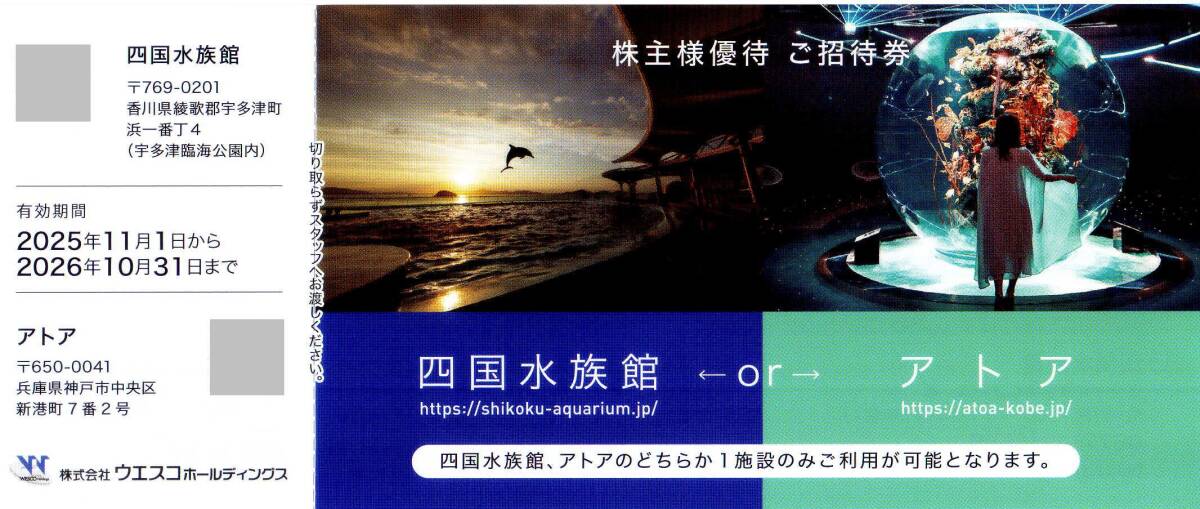 ご覧頂きありがとうございます。 商品掲載内容未確認によるトラブル防止のため、必ず最後まで掲載内容をお読み頂き、商品掲載内容にご同意の上、ご入札下さい。 ★最新 四国水族館 アトア ウエスコホールディングス株主様ご優待ご招待券★送料無料条件有★です。 入札は、ウエスコホールディングス株主様ご優待ご招待券1枚当たりの金額でお願いいたします。 ◇◆商品説明◆◇ ★本券1枚で、1名様1回限り無料でご入場頂けます。 ★四国水族館、アトアのどちらか1施設のみご利用が可能です。 ★有効期間は、2025年11月1日~2026年10月31日です。 ◇◆発送方法と送料について◆◇ ★送料は、落札者様のご負担でお願いいたします。基本発送は、普通郵便(定形郵便)にて発送させて頂きます。 但し、郵便事故による不着、あるいは郵送中の損害による返金、あるいは代替商品補償の責任は負いかねますのであらかじめご了承下さい。 ご不安な場合には、追跡記録可能または損害補償対象の発送方法をお奨めいたします。なお、郵便事故が発生した場合には、出来る限りのご協力はさせて頂きます。 また、郵便配達サービス変更に伴い、土曜日配達の中止、お届け日数の繰り下げが実施されています。普通郵便・特定記録郵便の場合、到着まで時間を要する場合がございます。 あらかじめご了承頂くとともに余裕をもったご対応を頂きますようにお願いいたします。 ●普通郵便(定形郵便)は110円(発送重量50gまで)(損害補償対象外)(土曜日・日曜日・休日配達中止) ●特定記録郵便は、普通郵便(定形郵便)+210円(追跡記録可能)(損害補償対象外)(土曜日・日曜日・休日配達中止) ●速達郵便は、普通郵便(定形郵便)+300円(損害補償対象外)(土曜日・日曜日・休日配達実施) ●書留郵便は、普通郵便(定形郵便)+480円(追跡記録可能)(損害補償対象)(土曜日・日曜日・休日配達実施) ●簡易書留郵便は、普通郵便(定形郵便)+350円(追跡記録可能)(損害補償対象)(土曜日・日曜日・休日配達実施) ●レターパックプラスは600円・レターパックライトは430円(追跡記録可能)(損害補償対象外)(土曜日・日曜日・休日配達実施) ●スマートレターは210円(損害補償対象外)(土曜日・日曜日・休日配達中止) ★発送方法については、普通郵便(定形郵便)・特定記録郵便・速達郵便・簡易書留郵便・書留郵便・ゆうパック(損害補償対象)(土曜日・日曜日・休日配達実施)・ クロネコ宅急便(損害補償対象)・レターパック(プラス・ライト)・スマートレター等、落札者様のご希望発送方法に対応いたします。 但し、ミニレター(郵便書簡)、クリックポストについては対応いたしかねますのであらかじめご了承ください。 ★即決価格でご落札された場合には、普通郵便(定形郵便)に限り出品者が送料を負担いたします。 また、即決価格の90%以上でご落札された場合には、普通郵便(定形郵便)に限り出品者が送料の50%を負担いたします。 但し、即決価格、あるいは即決価格の90%以上でご落札された商品を普通郵便(定形郵便)以外の発送方法でご希望される場合、送料は落札者様全額ご負担とさせて頂きます。 あらかじめご了承下さい。 なお、即決価格、あるいは即決価格の90%以上でご落札された商品と同梱発送をご希望される場合、送料は落札者様全額ご負担とさせて頂きます。あらかじめご了承下さい。 ◇◆備考・その他◆◇ ●誠実、迅速に対応いたしますので、よろしくお願いいたします。 ●自己紹介欄もどうぞご覧下さい。 ●他にも多数出品しておりますのでどうぞご覧下さい。 ●ご落札から48時間以内に落札者様情報のご連絡を必ずお願いいたします。 ご連絡を頂けない場合には、お取引の意思がないと判断させていただき、落札者様のご都合により即キャンセルとさせて頂きます。十分にご留意下さい。 また、落札者様情報のご連絡があるまでは、取引メッセージによるご質問等には一切ご回答いたしかねますのであらかじめご了承下さい。 ●落札者様情報のご連絡を頂いた後、落札者様から何もご連絡がなく、ご落札から72時間以内にご決済頂けない場合には、 落札者様のご都合により即キャンセルとさせて頂きます。十分にご留意下さい。 また、落札者様からご連絡があった場合でも、かんたん決済支払期限を超過した場合は、落札者様のご都合により即キャンセルとさせて頂きます。 なお、この場合、出品者にて商品を削除させて頂く際、落札者様の評価に対して「非常に悪い」を付けさせて頂きます。ご了承の上、十分にご留意下さい。 なお、この場合には、出品者への評価は一切不要です。ご遠慮下さい。但し、落札者様から、その他のお支払い方法をご提示頂いた場合にはその限りではありません。 但し、その他のお支払い方法のご提示は、かんたん決済支払期限前日の23:00までとさせて頂きます。 ●同梱発送については対応可能です。ただし、同梱発送条件は、最初の商品ご落札から72時間以内までのご落札商品を同梱発送扱いとさせて頂きます。 同梱ご発