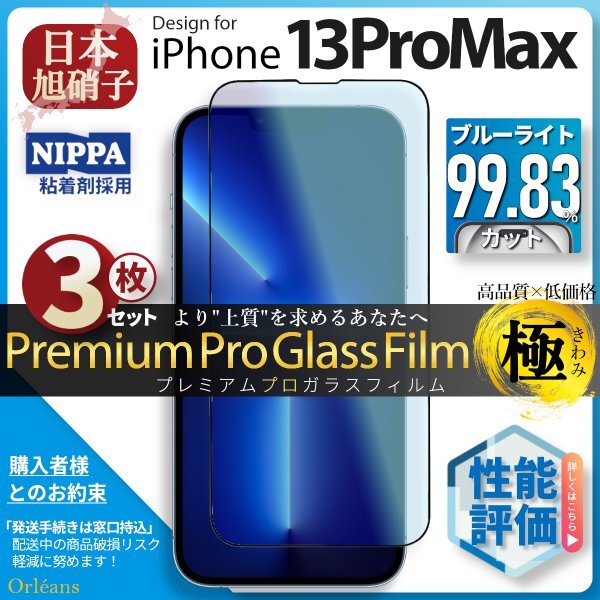 iPhone 13 ProMax ブルーライトカット 強化ガラスフィルム 超得3セット 旭硝子 全面保護 自動吸着 保護フィルム 液晶保護フィルム