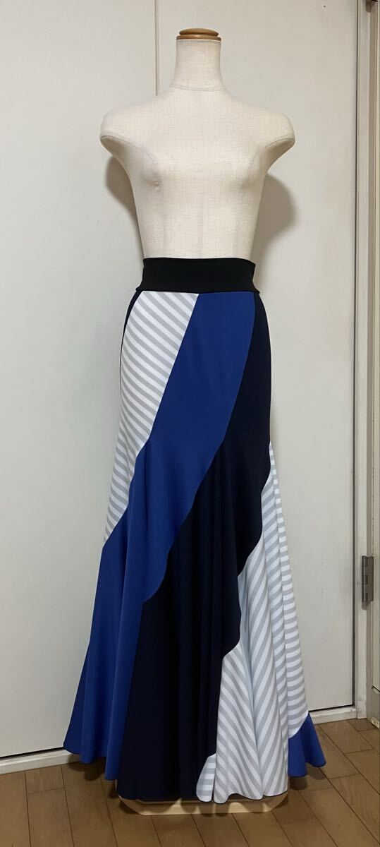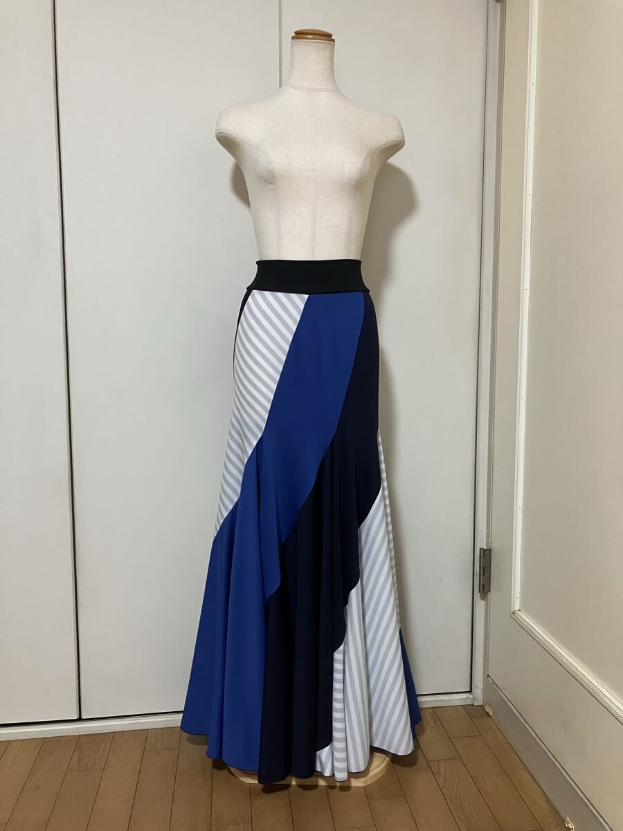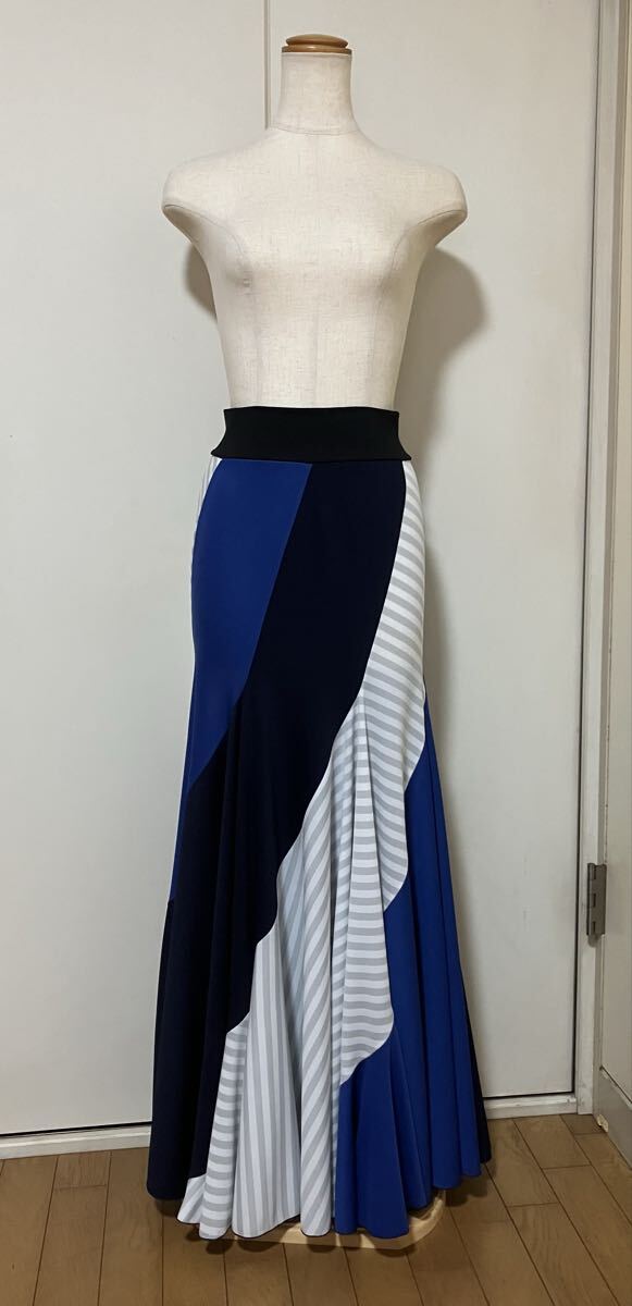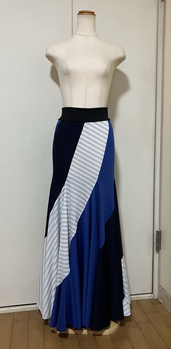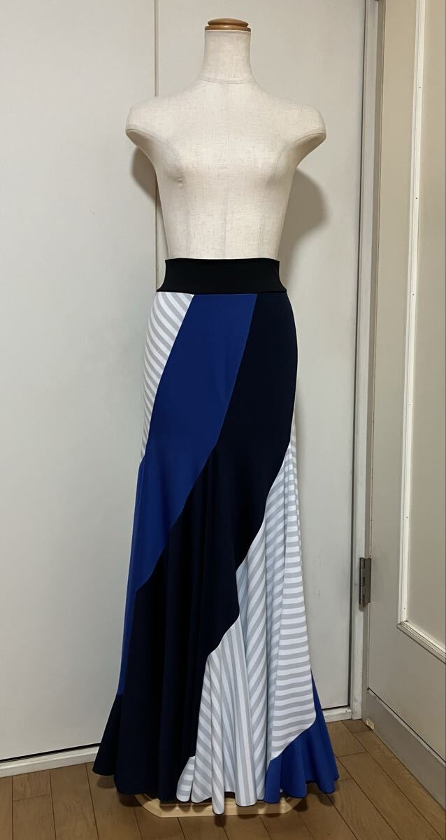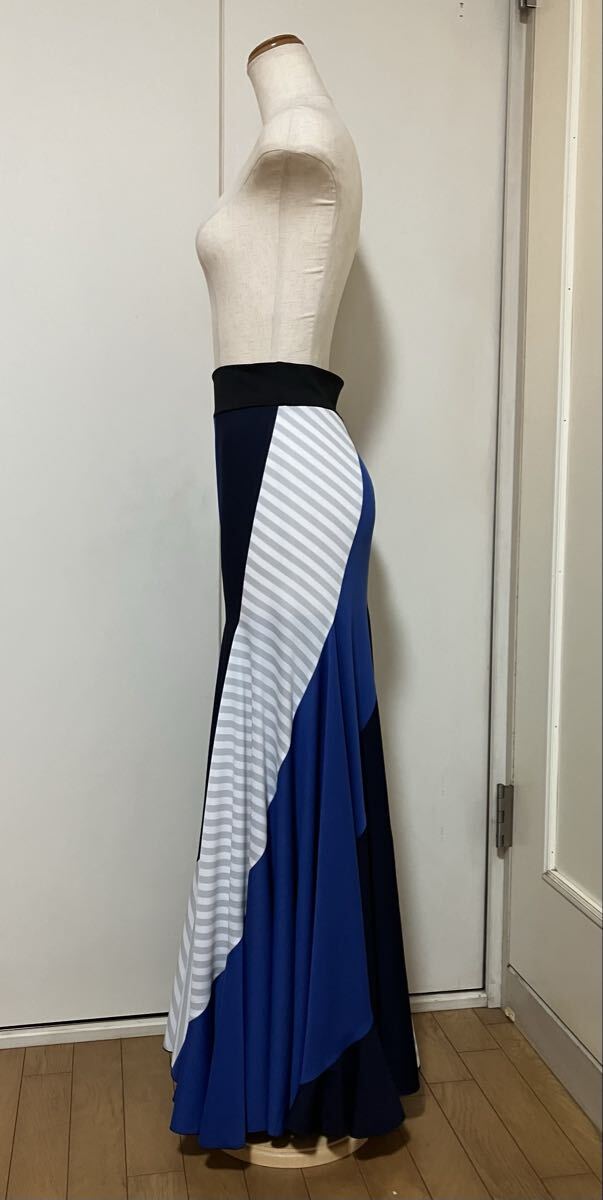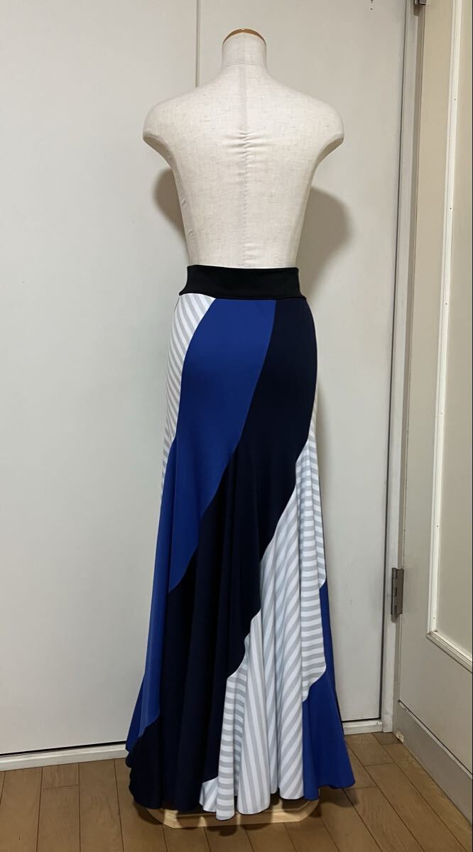 ウエストベルトは黒のやや厚ポリエステルジャージ、ウエストベルト以下 ネイビーの中〜微厚ポリエステルジャージ、ブルーの中〜微厚ポリエステルジャージ、白地にライトグレーのボーダープリントの中〜微厚ポリエステルジャージです。