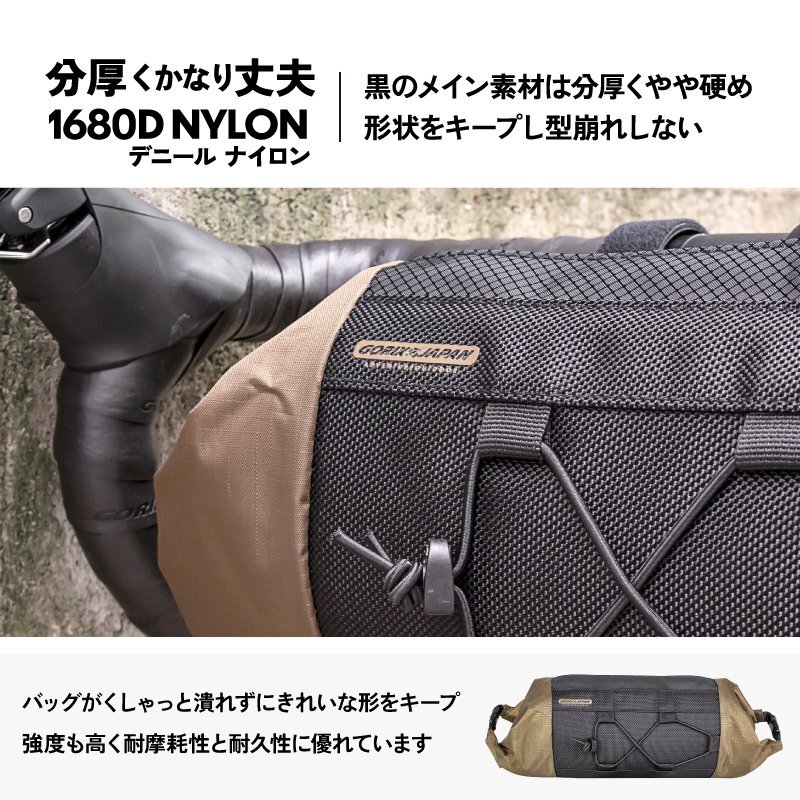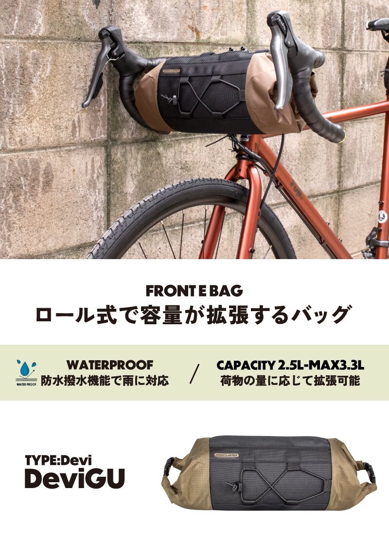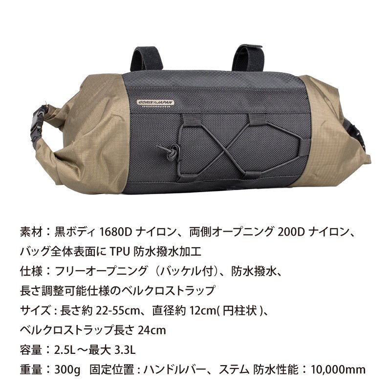 EXPLANATION 荷物の量に応じてロールして拡張する容量、そしてサイドから荷物を取出す事も可能。 メイン素材はとても分厚く丈夫な1680Dナイロンで強く扱いやすい。 バッグ前面にはTPU防水撥水加工を施し雨や水を弾きます。 ドロップハンドルへの装着もできる使い勝手の良いハンドルバーバッグ。 3点で固定し振動や揺れに対応。 ロードバイクやMTB、クロスバイクなどあらゆる自転車に装着が可能に。 土系カラーはアウトドアなオフロードにもマッチ。 ツーリングやブルペ、自転車通勤など様々な場面にあったフロントバッグです。 FEATURES ●バッグ全体表面にTPU防水撥水加工 ●黒ボディ部分は(1680Dナイロン)で厚くかなり丈夫 ●容量は荷物の量に応じて拡張可能 ●形状をキープし型崩れしない ●ドロップハンドルにも装着可能 ●フロントライトの装着も可能 ●3点固定で揺れない ●土系カラーでアウトドアな印象に [容量] 2.5L~最大3.3Lでメインのジップポケット、もしくは横から収納する事が可能。 また前面には小物を挟めるドローコード(紐)付き。 [防水撥水機能] 表地は防水撥水TPU加工で、防水性能が10.000mmに達し、小雨レベルの防水は可能。※完全防水ではありません [素材] メイン素材には分厚く頑丈な1680Dナイロンを採用し、バッグがくしゃっと潰れずにきれいな形をキープ。 強度も高く耐摩耗性と耐久性に優れています。 [ドロップハンドル] 幅の狭いドロップハンドルにも考慮した横幅サイズ。 フラットハンドルだけでなくドロップハンドルのロードバイクでもお使い頂けます。 [デザイン] 落ち着いたカラーはアウトドアっぽくもあり、都会的でもあり様々な自転車にマッチします。 デザイン性があるので自転車のファッションを楽しめます。 商品内容バッグ、ベルクロストラップ3本 素材黒ボディ1680Dナイロン、両側オープニング200Dナイロン、バッグ全体表面にTPU防水撥水加工 仕様フリーオープニング(バッケル付)、防水撥水、長さ調整可能仕様のベルクロストラップ サイズ長さ約22-55cm、直径約12cm(円柱状)、ベルクロストラップ長さ24cm 容量2.5L~最大3.3L 重量300g 固定位置ハンドルバー、ステム 防水性能10,000mm |