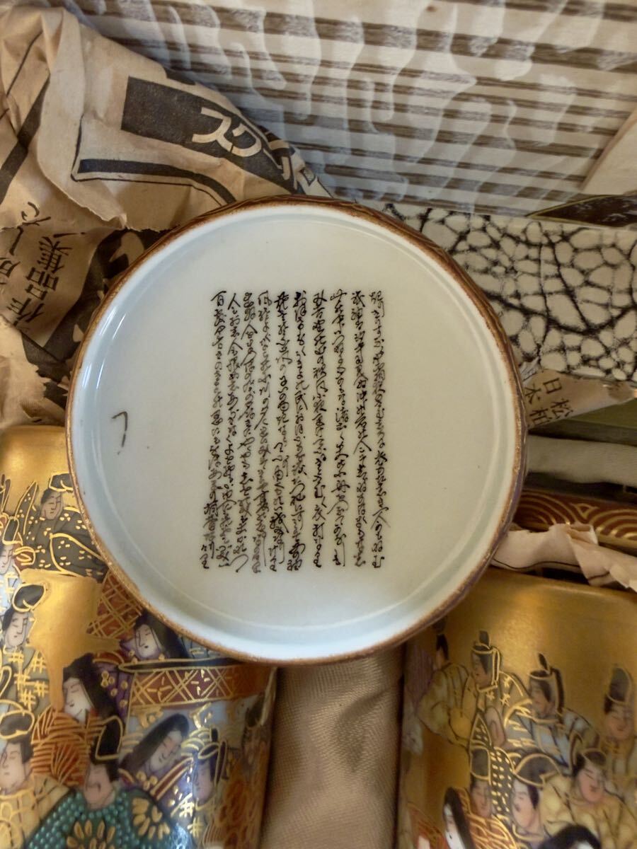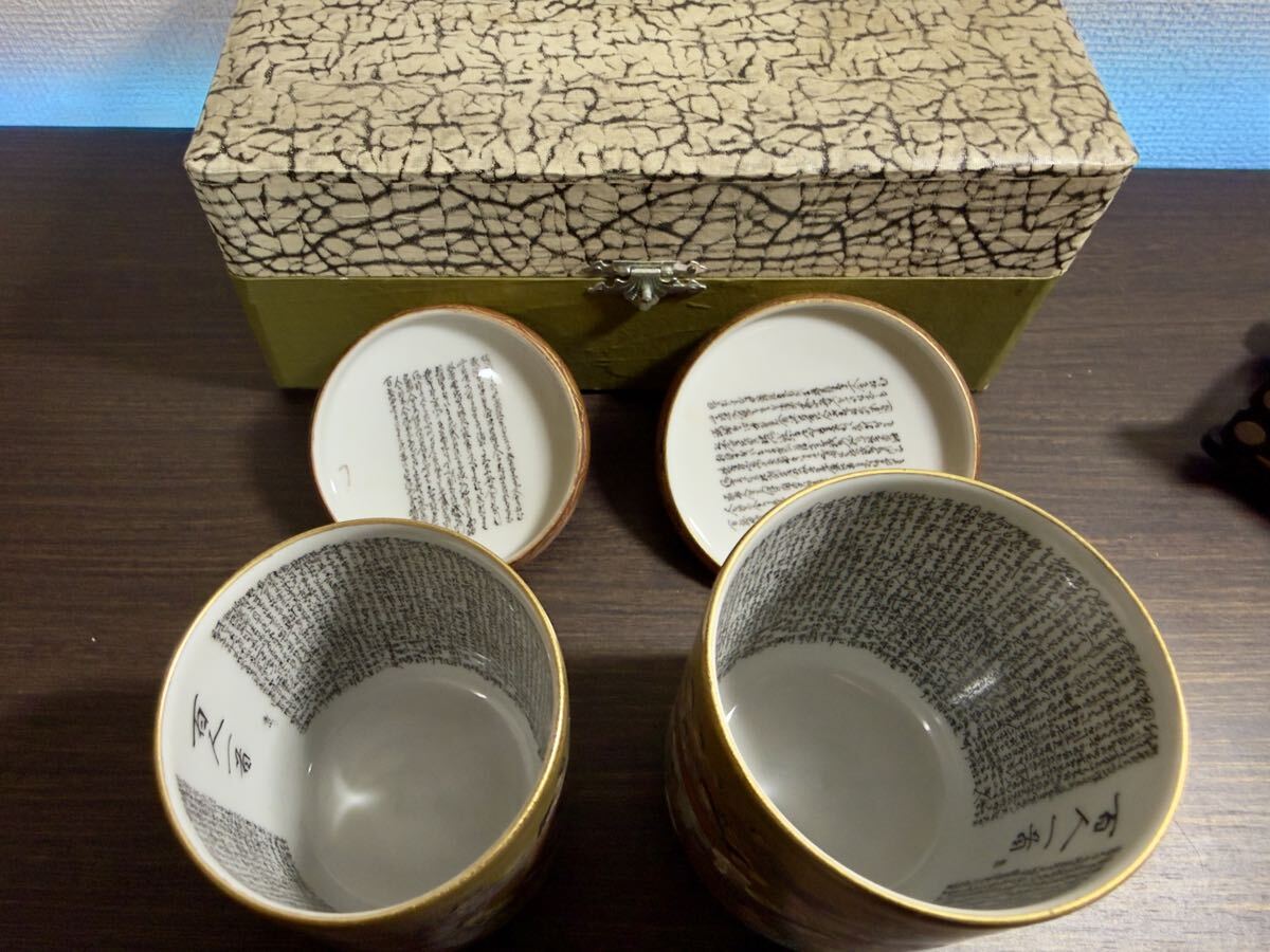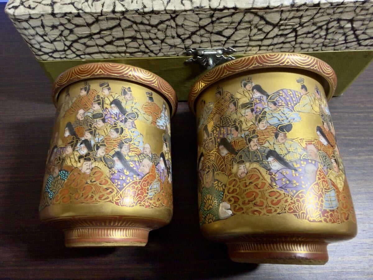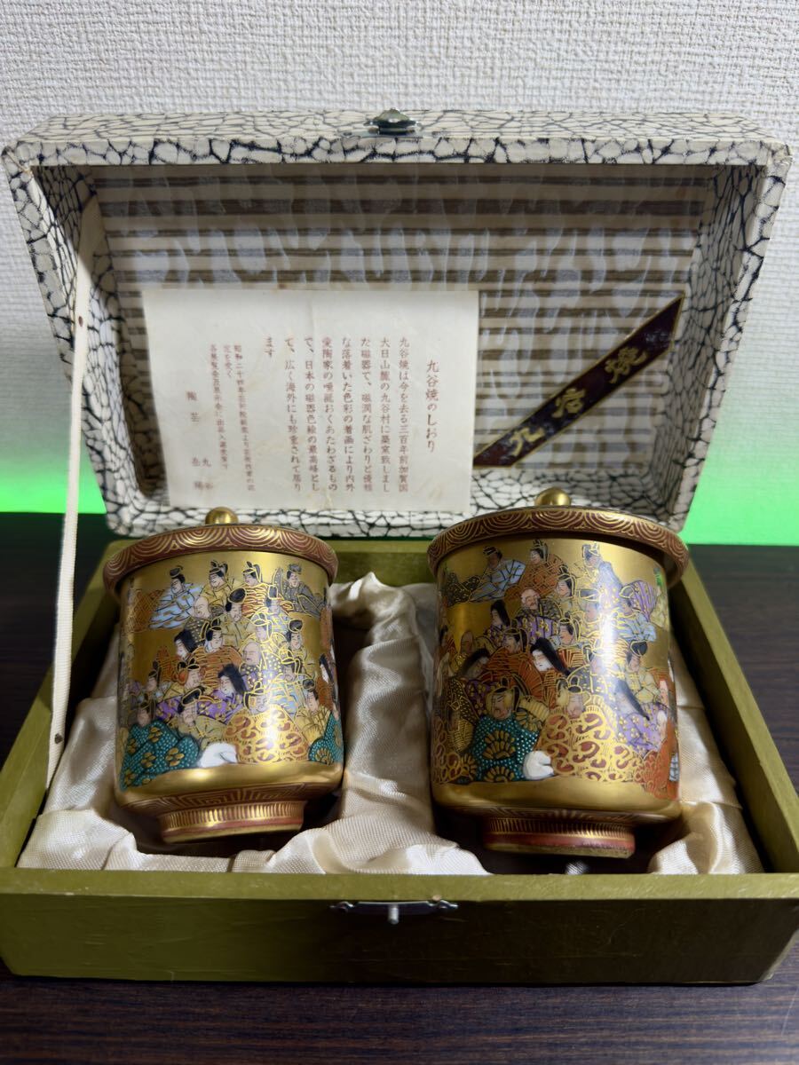 1円スタート 九谷焼 岳陽作 手描き 百人一首 蓋付組湯呑 毛筆細字 金彩蓋付湯呑 一対 真作保証 金彩 箱付き