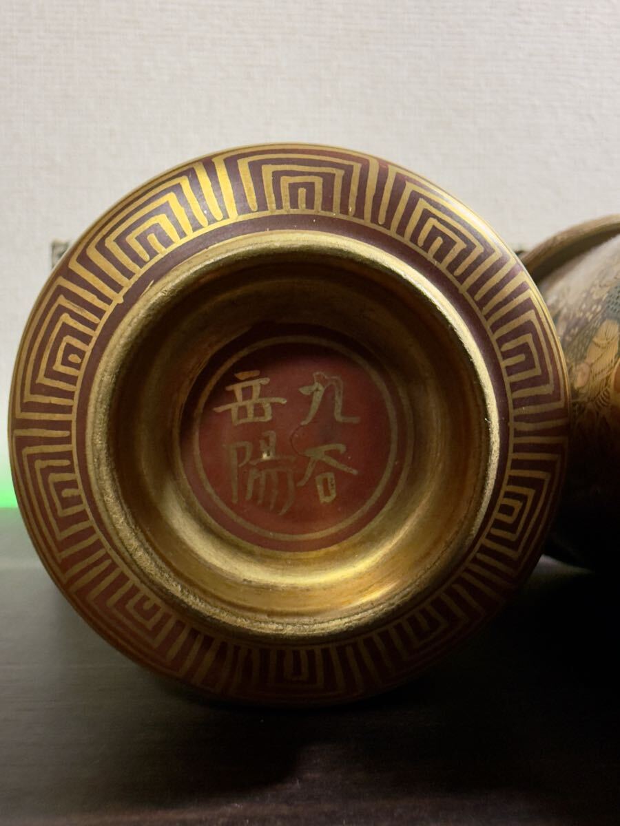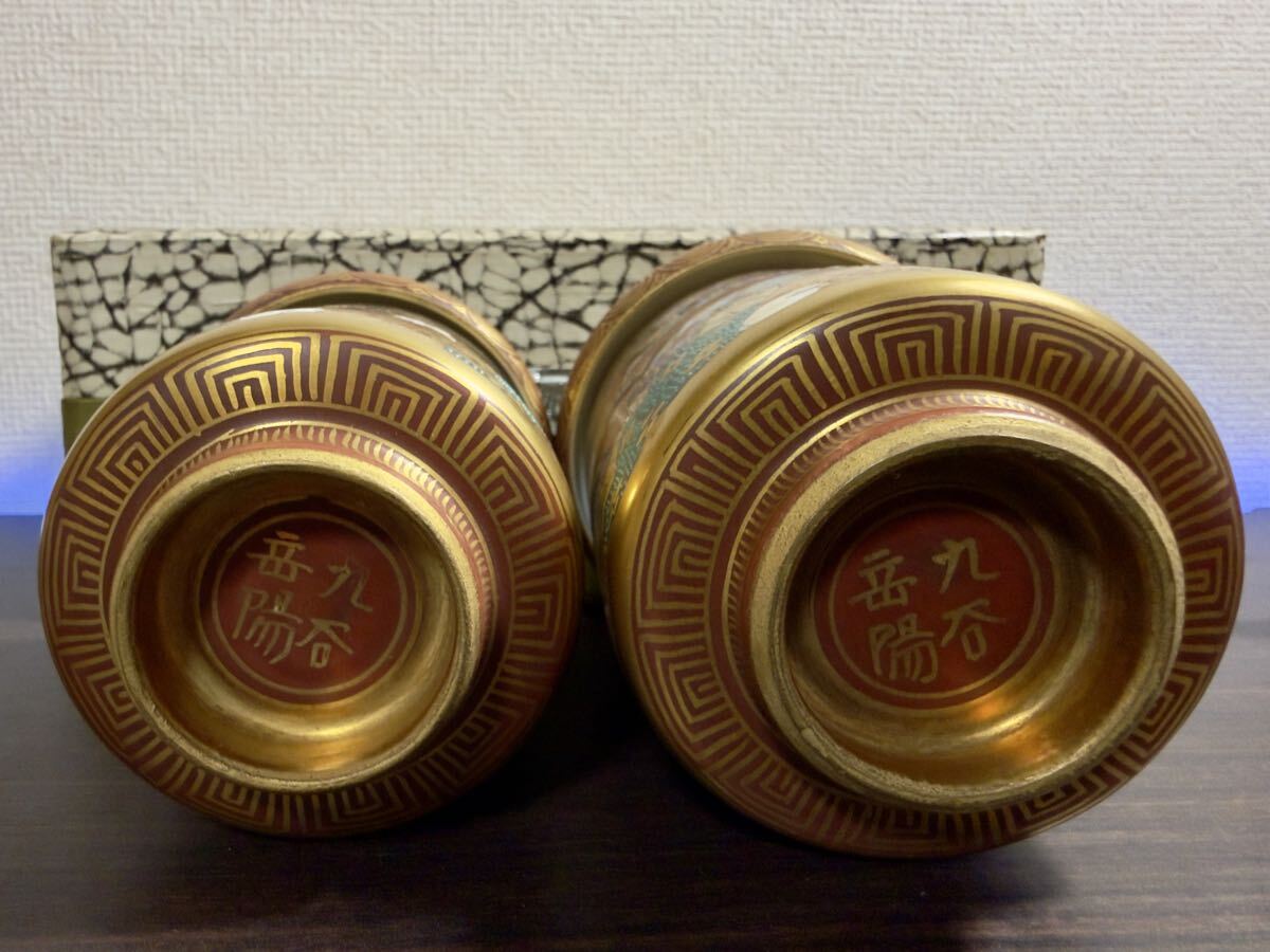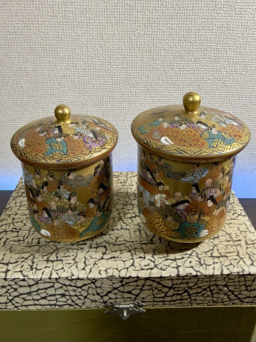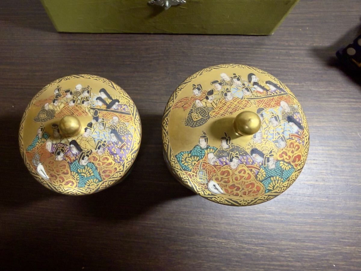 1円スタート 九谷焼 岳陽作 手描き 百人一首 蓋付組湯呑 毛筆細字 金彩蓋付湯呑 一対 真作保証 金彩 箱付き