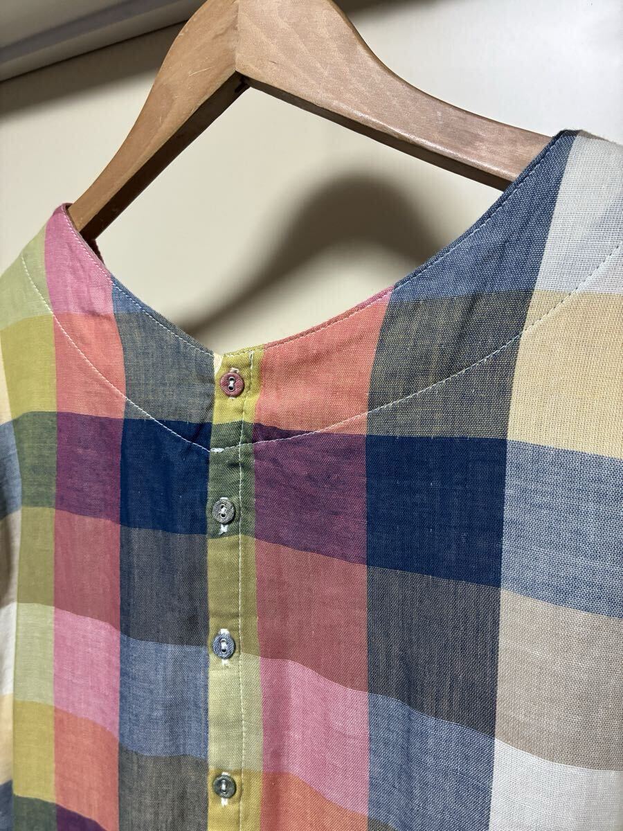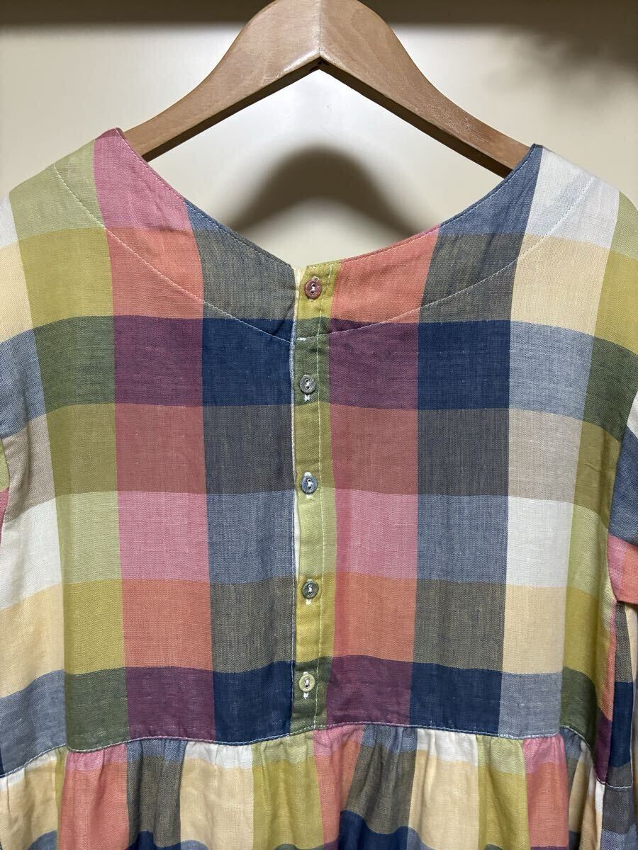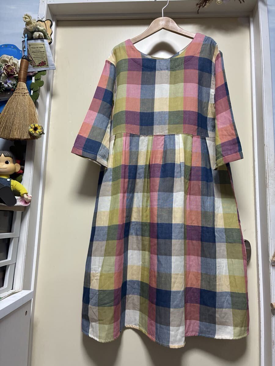 ★cest.bien.vous★カラフルな色合いのチェック柄でWガーゼのお洒落なワンピースになります。カラフルな色合いでウエスト辺りで切り替えられておりギャザー(前後)が入っています。お袖は揺ったりとしていて袖丈は八分袖くらいでしょうか。後ろ側の中心は、くるみボタンが5つ付いています。コットン100%で肌触りの良いお洒落な一枚に仕上がっています。