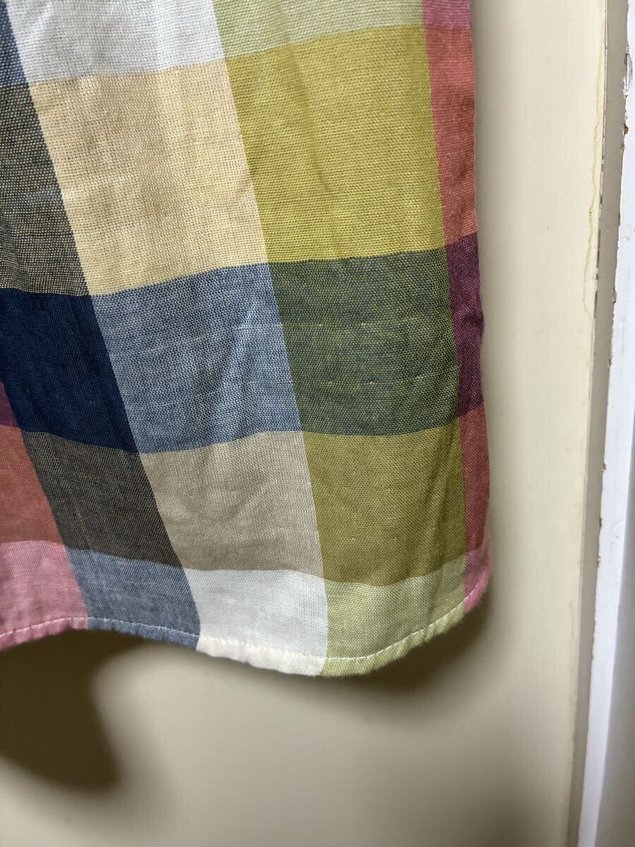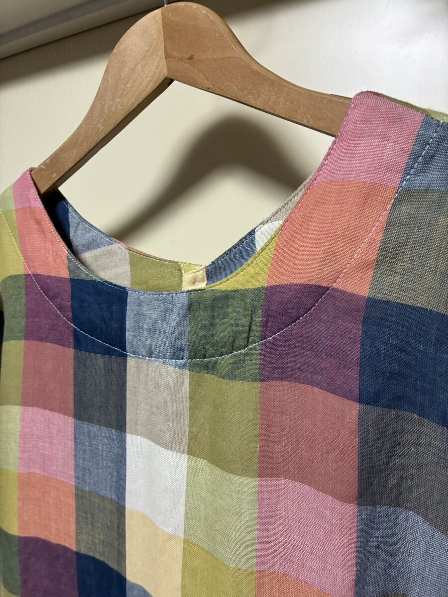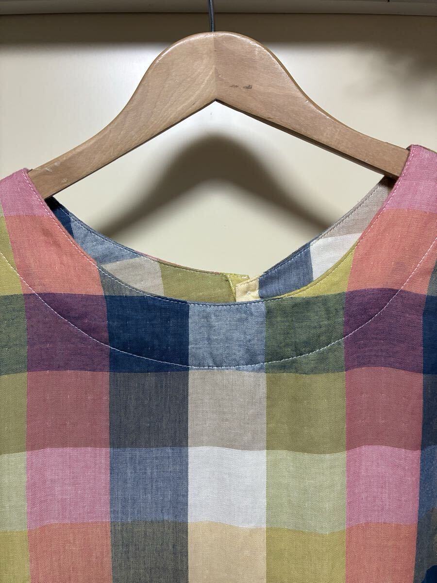 ★cest.bien.vous★カラフルな色合いのチェック柄でWガーゼのお洒落なワンピースになります。カラフルな色合いでウエスト辺りで切り替えられておりギャザー(前後)が入っています。お袖は揺ったりとしていて袖丈は八分袖くらいでしょうか。後ろ側の中心は、くるみボタンが5つ付いています。コットン100%で肌触りの良いお洒落な一枚に仕上がっています。