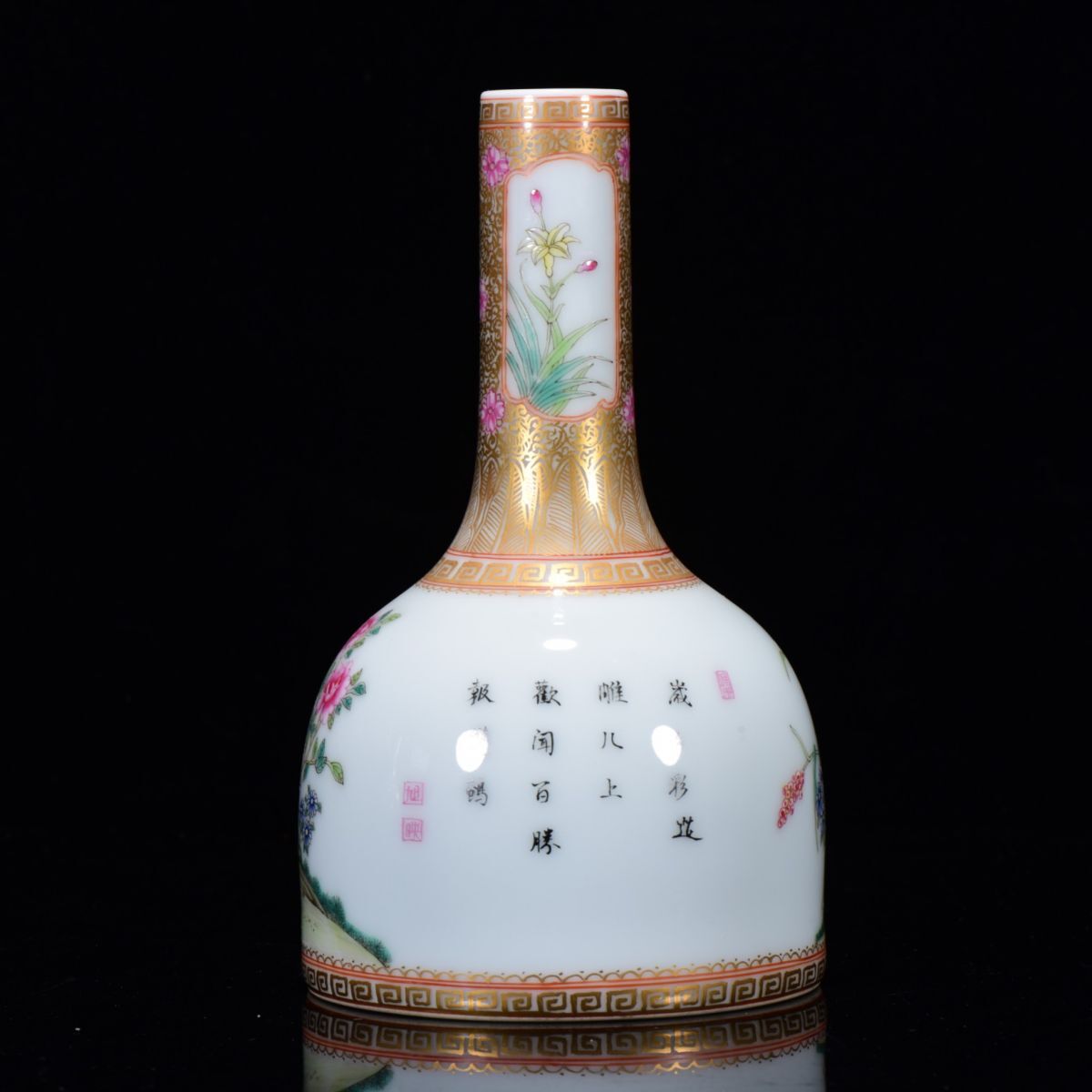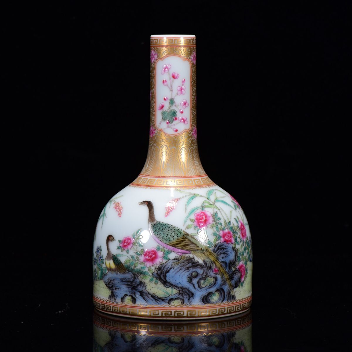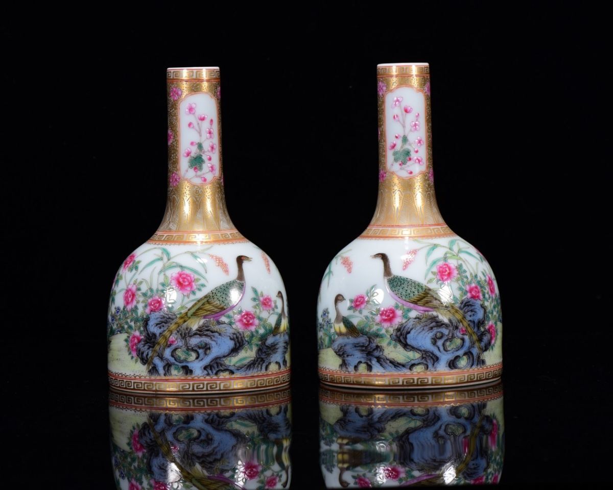 永し 清時代 雍正年製 粉彩描金 花鳥紋 搖鈴瓶 一対 古陶磁器 陶芸 皿 中国陶瓷器 唐瓷 置物擺件 古美術品 古賞物 収集 旧家蔵出 中国唐物