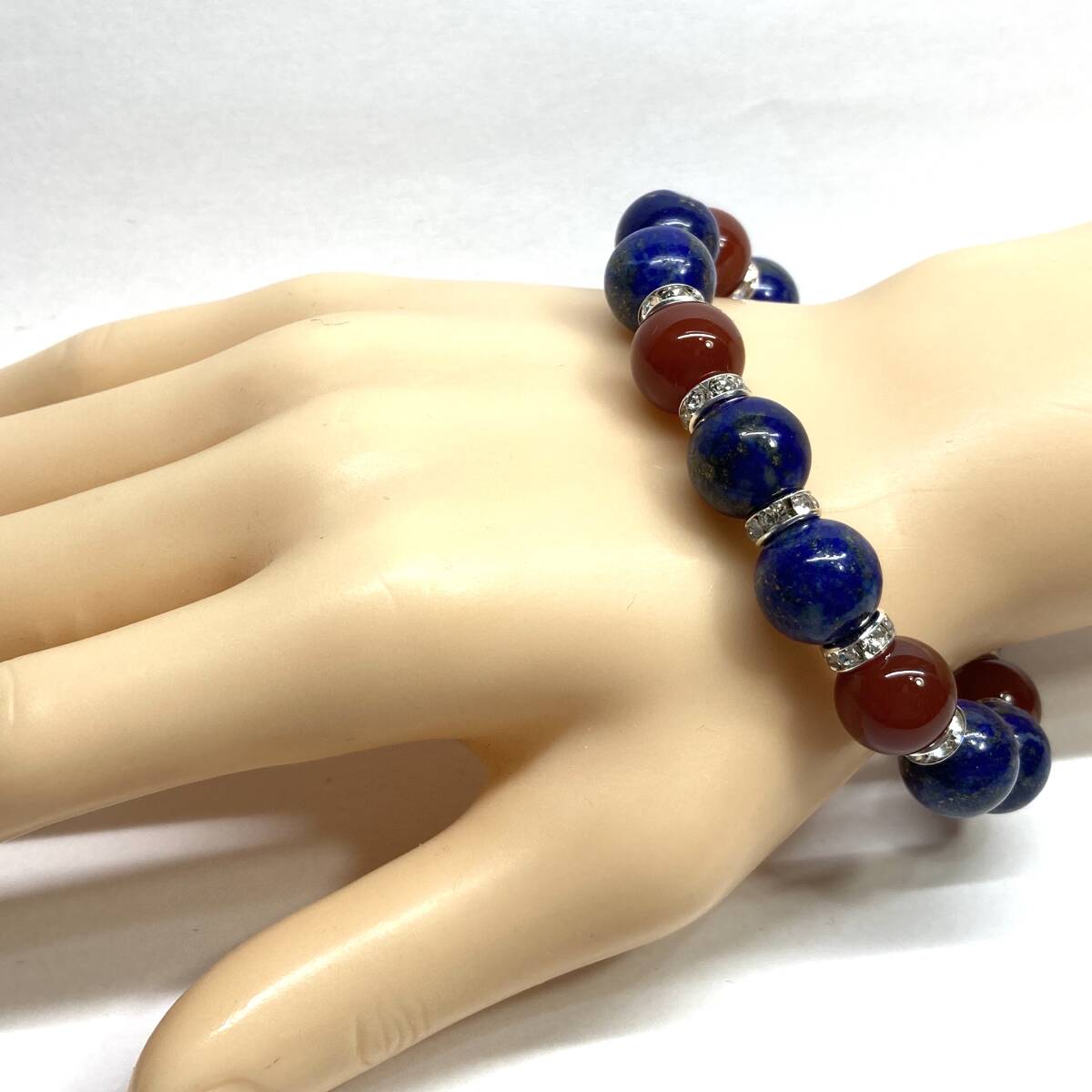 こちらは、ラピスラズリと赤瑪瑙を組み合わせたパワーストーンブレスレットです。間にはロンデルを挟み高級感あるデザインに仕上げております。程よくインパクトがある12mm玉を使用して内周約18cmです。(サイズ変更の場合は取引ナビにてご連絡をお願いします。) 数に限りがございますので気になる方はお早めにどうぞ。