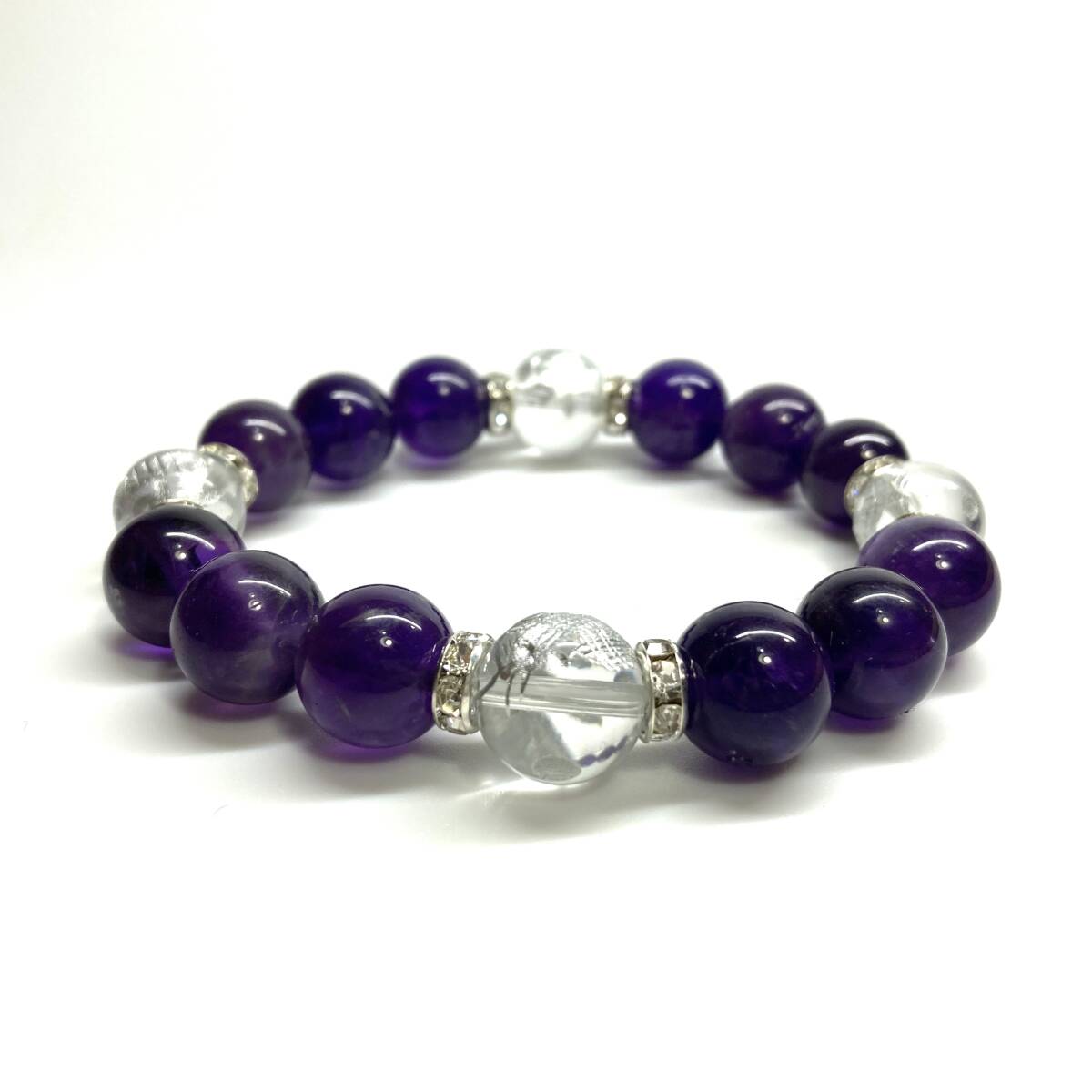 高貴な色を表す紫色をしたアメジストは霊性の高いパワーストーンと言われ、マイナスのエネルギーをプラスに変える効果があるといわれています。冷静な判断力、インスピレーション、直観力を高め、創造性を豊かにして、第六感を高めると言われ仕事、金運アップにも効果があると言われています。ストレスや過労、自律神経の乱れ、不眠のときにも有効です。「愛の守護石」として大切な人との心の絆を深め、真実の愛を守り抜く強さをはぐくむ、愛の成熟に力を与えてくれるパワーストーンです。