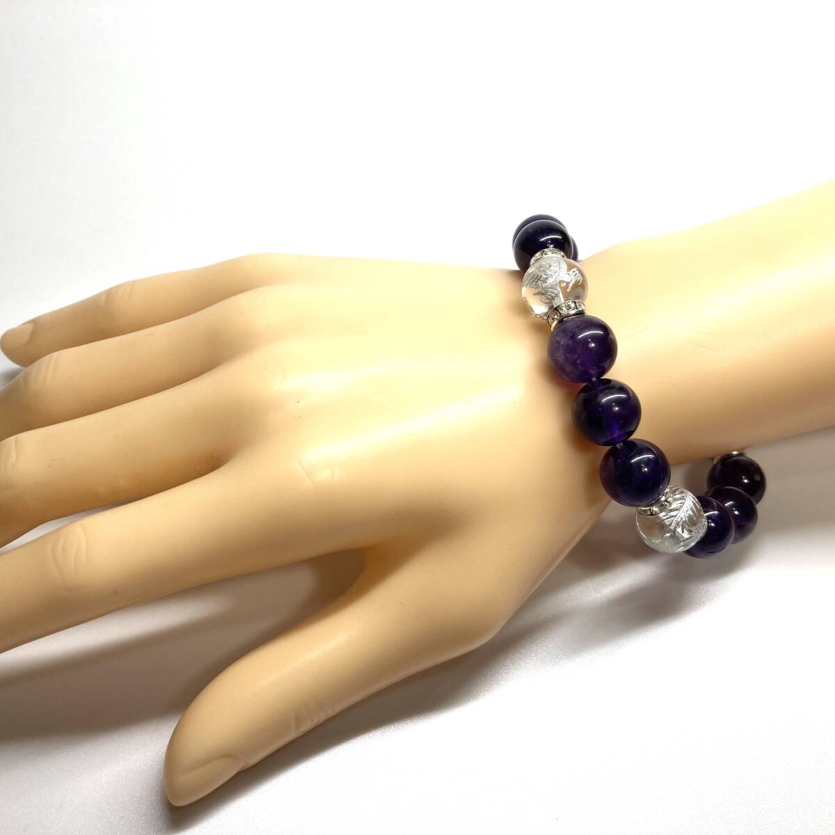 こちらは、四神獣銀彫水晶とアメジストを組み合わせたパワーストーンブレスレットです。四神獣は、中国の伝説で4つの方向(東西南北)を守護する神聖な神。四神獣、厄災から身を守り、多くの運気を呼び込むと言われております。石大きさは程よくインパクトのある12mm玉で内周 約17cmです。 数に限りがございますので気になる方はお早めにどうぞ。