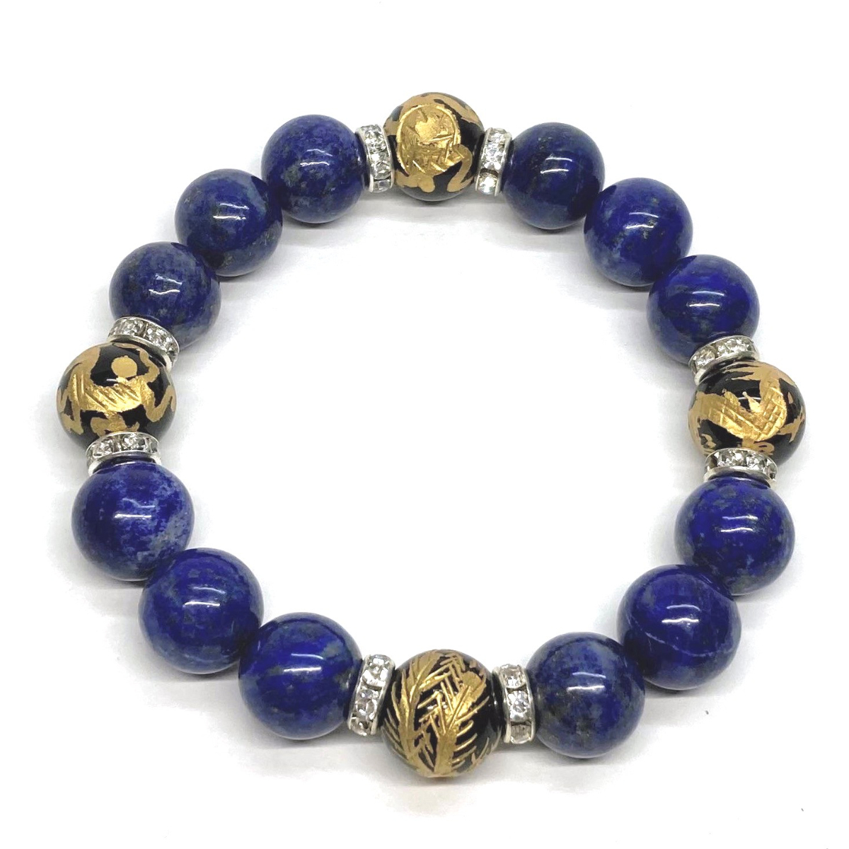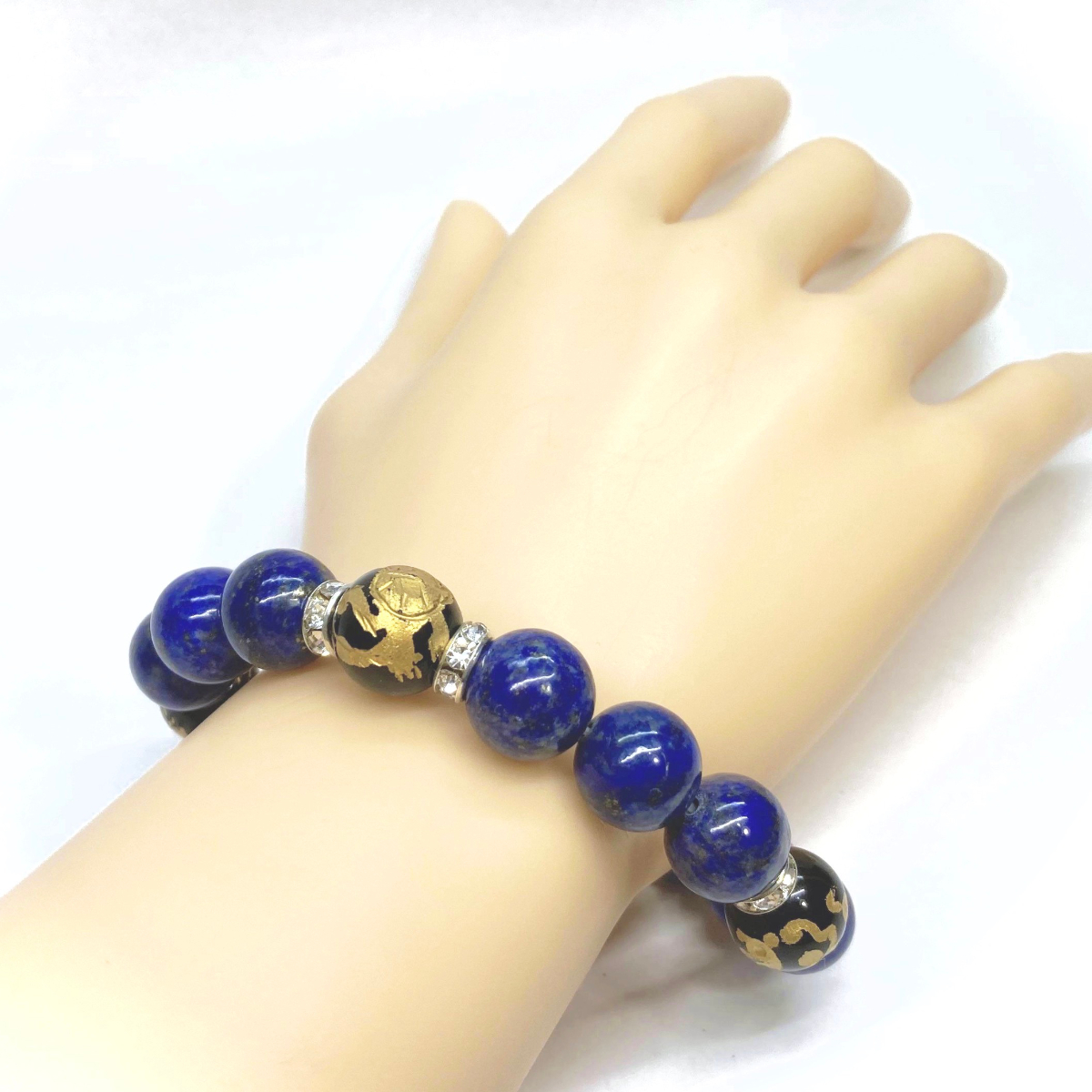 こちらは、四神獣金彫オニキとラピスラズリを組み合わせたパワーストーンブレスレットです。四神獣は、中国の伝説で4つの方向(東西南北)を守護する神聖な神。四神獣、厄災から身を守り、多くの運気を呼び込むと言われております。石大きさは程よくインパクトのある12mm玉で内周 約17cmです。 数に限りがございますので気になる方はお早めにどうぞ。