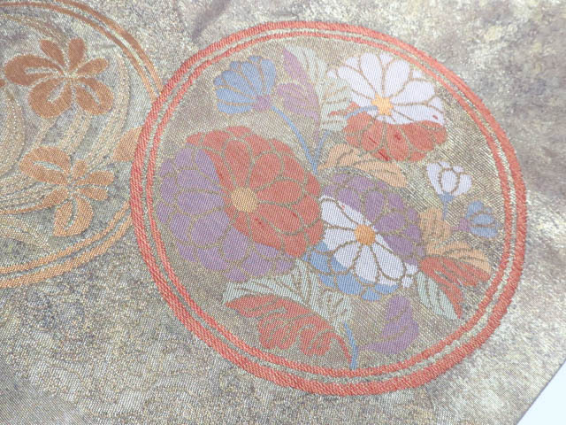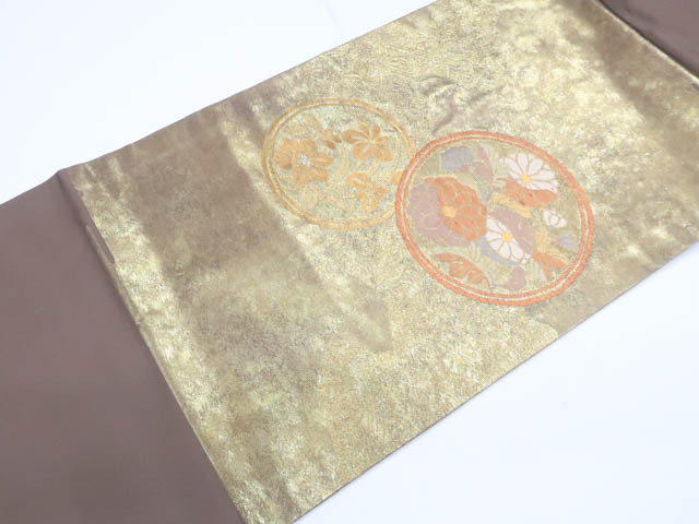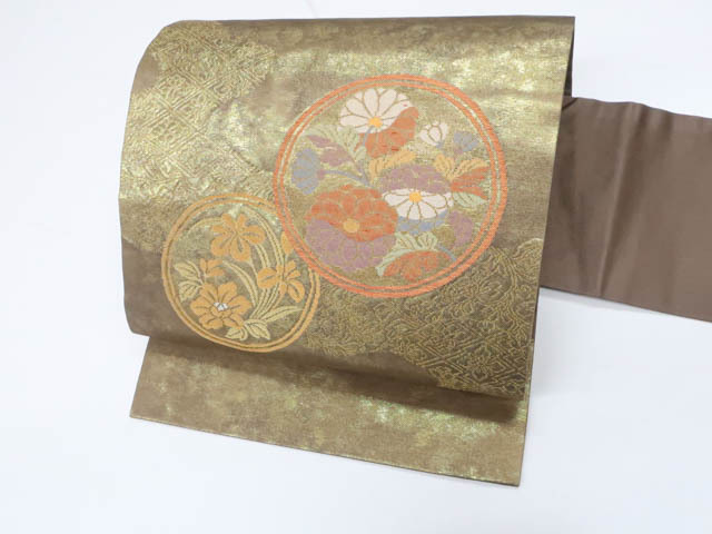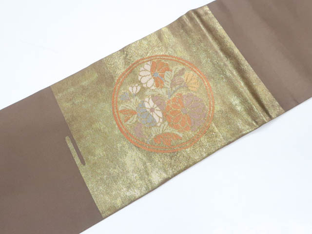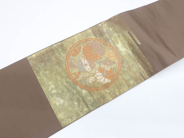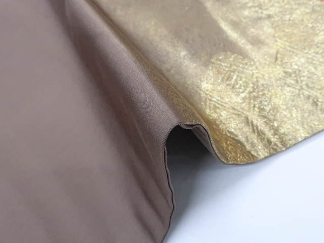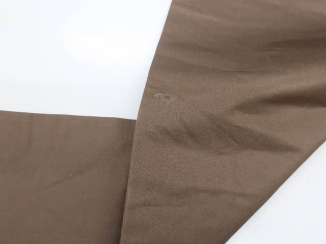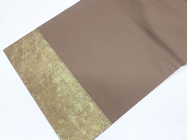 リサイクル商品でございますので無地場に汚れがございますが、ご使用いただけるかと存じます。 地色は茶・金です。 1枚目の画像が近いお色かと思われます。 素材は正絹です。 |