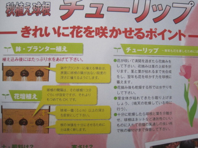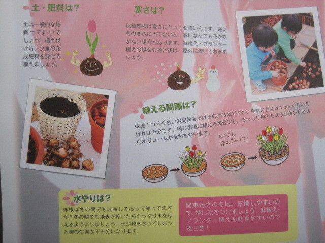 植えつけ適期は秋~年末です。日当たりのよい場所で、よく耕した土に化学肥料等をまぜ、球根の高さの3倍ほどの深さに植えます。一定期間低温に当たることで開花しますので、鉢植えでも冬は戸外の寒い場所で管理してください。また、水切れすると花が咲かなくなりますので、冬もたっぷり水をやってください。(沖縄地域では花が咲かないことがありますので、ご注意ください)