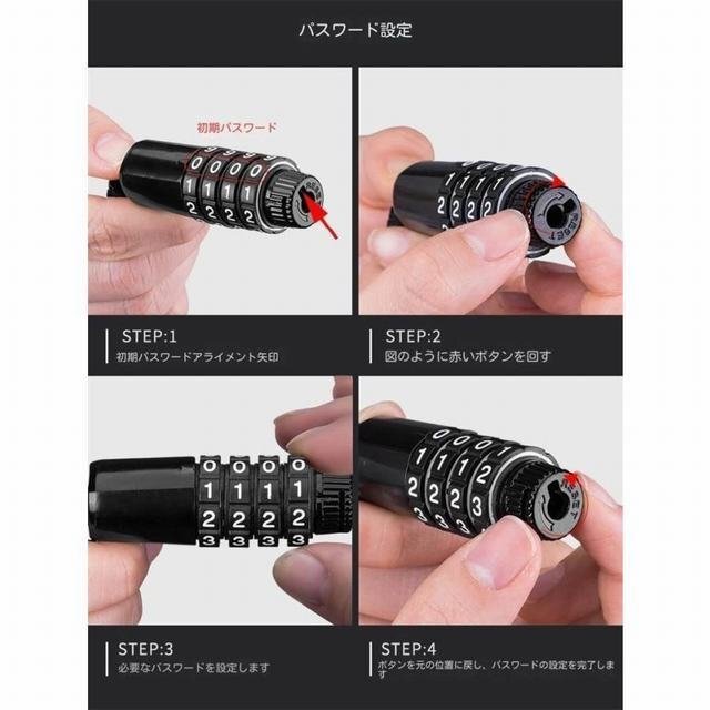 鍵不要の4桁ダイヤル式自転車ロックです、「10000通り」の番号を自由に設定できるため、防犯性能が強いです。鍵を紛失する心配はありません、もっと便利です。 約100cmの長さなので、自転車やロードバイク、クロスバイク、バイク、原付などを街中のどこにでも手軽にロックすることができます。約504gの軽量なロックです、未使用時はカバンに入れて持ち運び、自転車のシートポストに巻きつけたりと、携帯性にも優れています。 内部は4mm仕様の高い強度のスチールを採用して、外表は強靭性のナイロンを包んでいます、耐摩耗性が優れます。ABS製ダイヤルと亜鉛合金製ロック芯で、長時間使用することが確保します。 複雑の設置方法ではありません、初期パスワード「0000」です、手軽にお好きな新番号を設定できます。簡単な操作性、かつ高い安全性を両立させたバイクロックです、大切な愛車を守ってくれる必需品です。