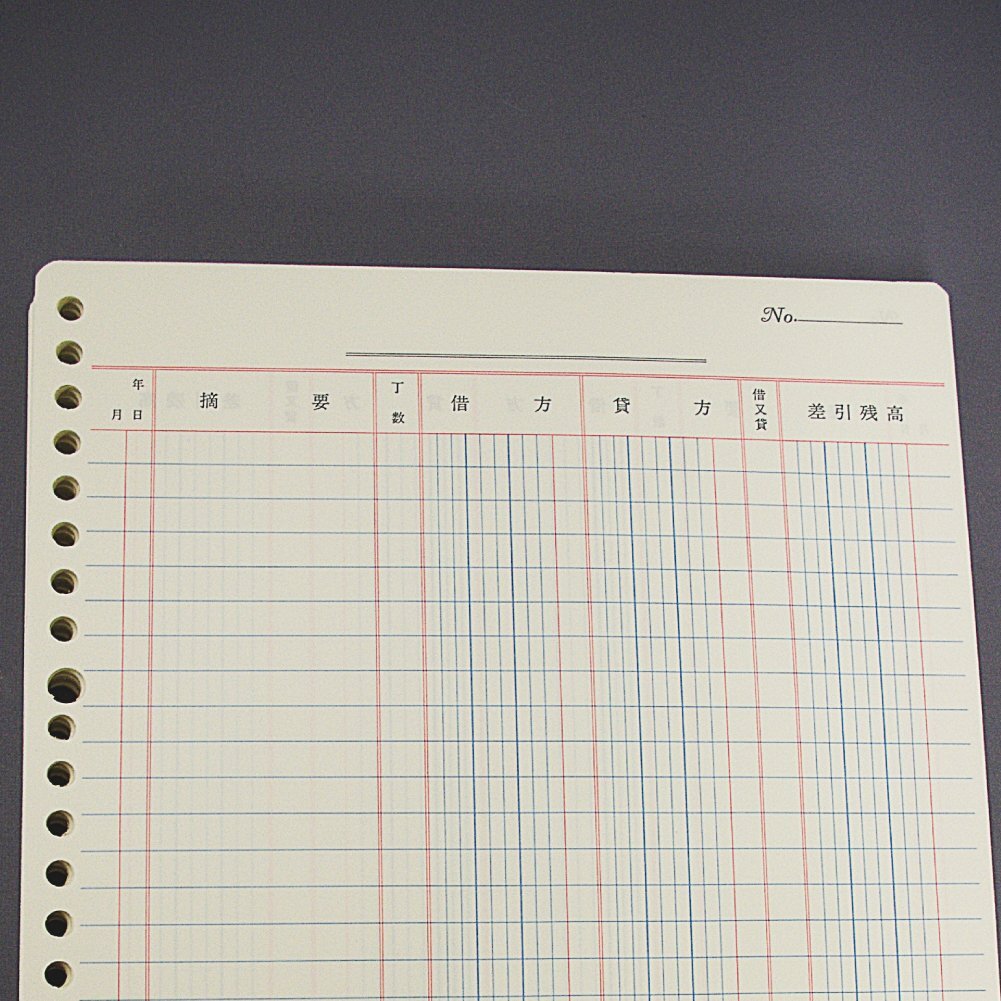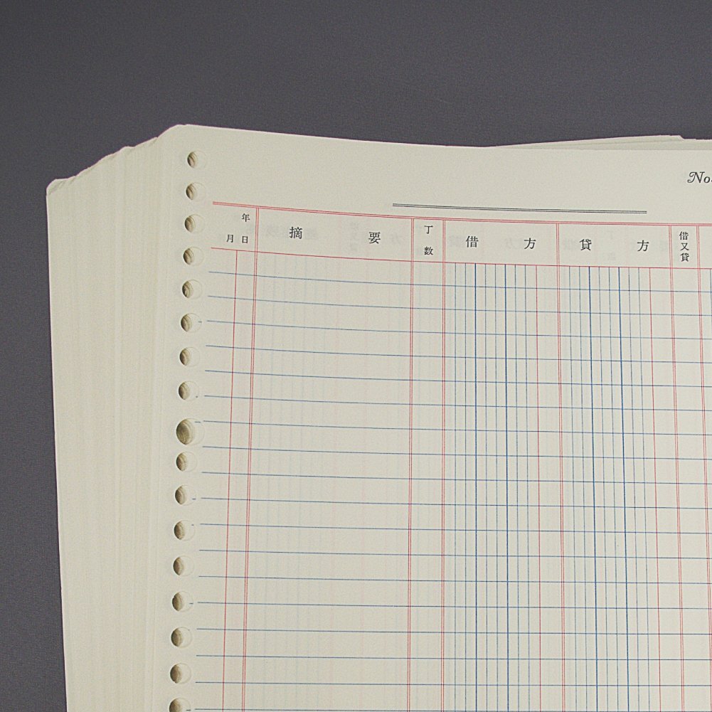 ●B5サイズ相当のリーフ「元帳」です。 ●ルーズリーフ用に漉(す)かれた紙を採用しているため、記帳の際に目が疲れず、インクのにじまないペン滑りの快適な手書き用リーフです。 ●罫内容は帳簿と同じく三色刷りのため、区分が明瞭で楽に記帳できます。