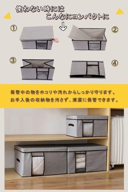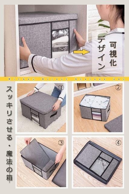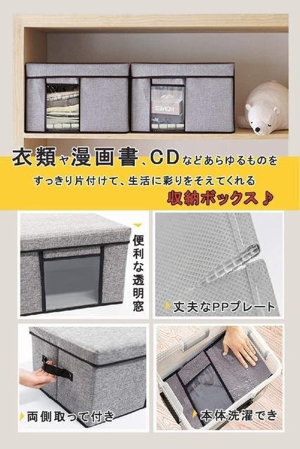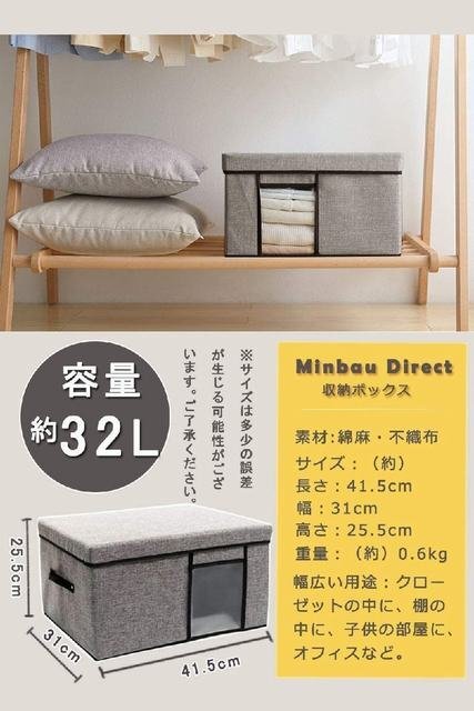 【商品仕様】素材:綿麻+不織布 サイズ:写真をご参照ください。 容量:約32L (サイズと容量は多少の誤差が生じる可能性がございます。) 【堅固な中身】 収納ボックスの内部は丈夫なPPプレートを支えて、型が崩れにくい、そして両側に頑丈な取っ手が付きで、耐荷重も優れて非常に耐用です。 使用するときは何個のボックスを積み重ねることができるし、使わない時は畳んで部屋の隅や隙間などにもスリムに収納できます。どうしても部屋のスペース を節約できます。 【可視化デザイン】 正面は可視化の窓を設計されて、収納された中身の物を見やすい、衣替えの時に散らかすこともありません。 【幅広い用途】衣類、毛布、子供のおもちゃと書籍など多くのものを収納できます、便利で、大容量で、家に欠かさない物です。いろんな場合でも適用です、 クローゼットの中に、棚の中に、子供の部屋に、オフィスに等。 【洗濯可能】通気性と防水性に優れ、防虫、防カビ臭いの除去に効果があります。本体が汚れていても水洗いができて、肌着などを収納する時も安心です。