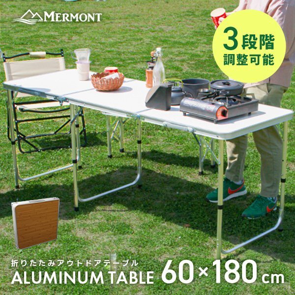 | 商品情報 かんたん組立の折りたたみアウトドアテーブル(6~8人用)です。 コンパクトサイズの180cm×60cm!! サビに強いアルミを使用! 天板には防水加工が施されています。 必要のない時は折りたたんで収納できる!! 取っ手付きで持ち運びもラクラク♪ 高さは「ハイスタイル」「ミドルスタイル」「ロースタイル」の3段階調節。 付属の脚ジョイントを使用する場合はハイスタイルとして、 脚ジョイントを使用しない場合はロースタイルとして、 使用することができます。 お好みや用途に合わせて使い分けることができる嬉しい仕様♪ キャンプ、バーベキュー、お花見などにとても便利! 【商品仕様】 カラー:ベージュ サイズ:(約)幅180×奥行60×高さ55/62/70cm 収納サイズ:(約)60×60×6.5cm 重量:(約)7.2kg 耐荷重:(約)20kg 【注意事項】 海外製品で簡易梱包での輸入の為風防に擦れや多少の小キズなどがある場合がございますが、商品自体には問題ありませんのでご了承下さい。 (アルミ 折り畳み 折りたたみテーブル アウトドアテーブル バーベキュー BBQ) |