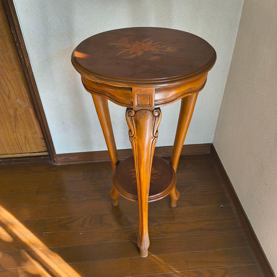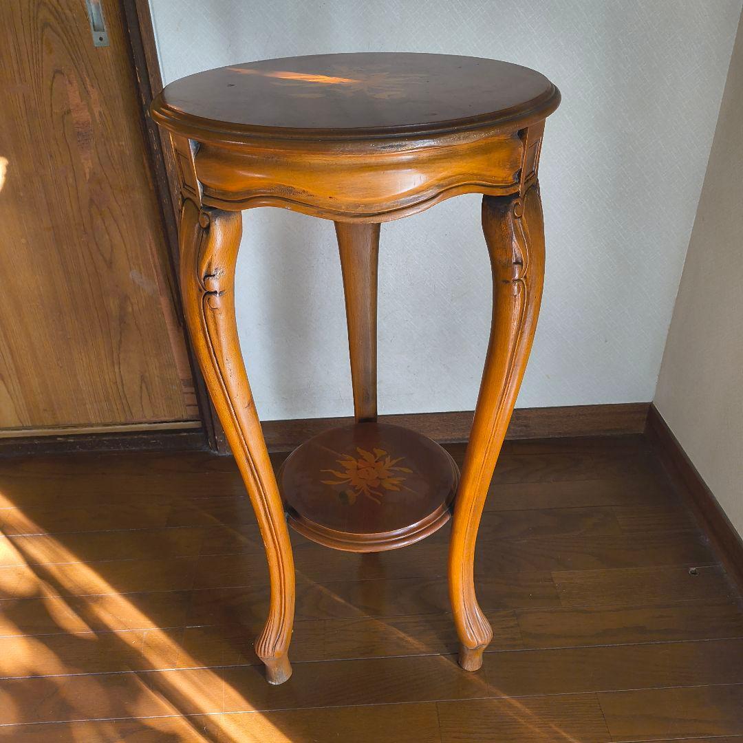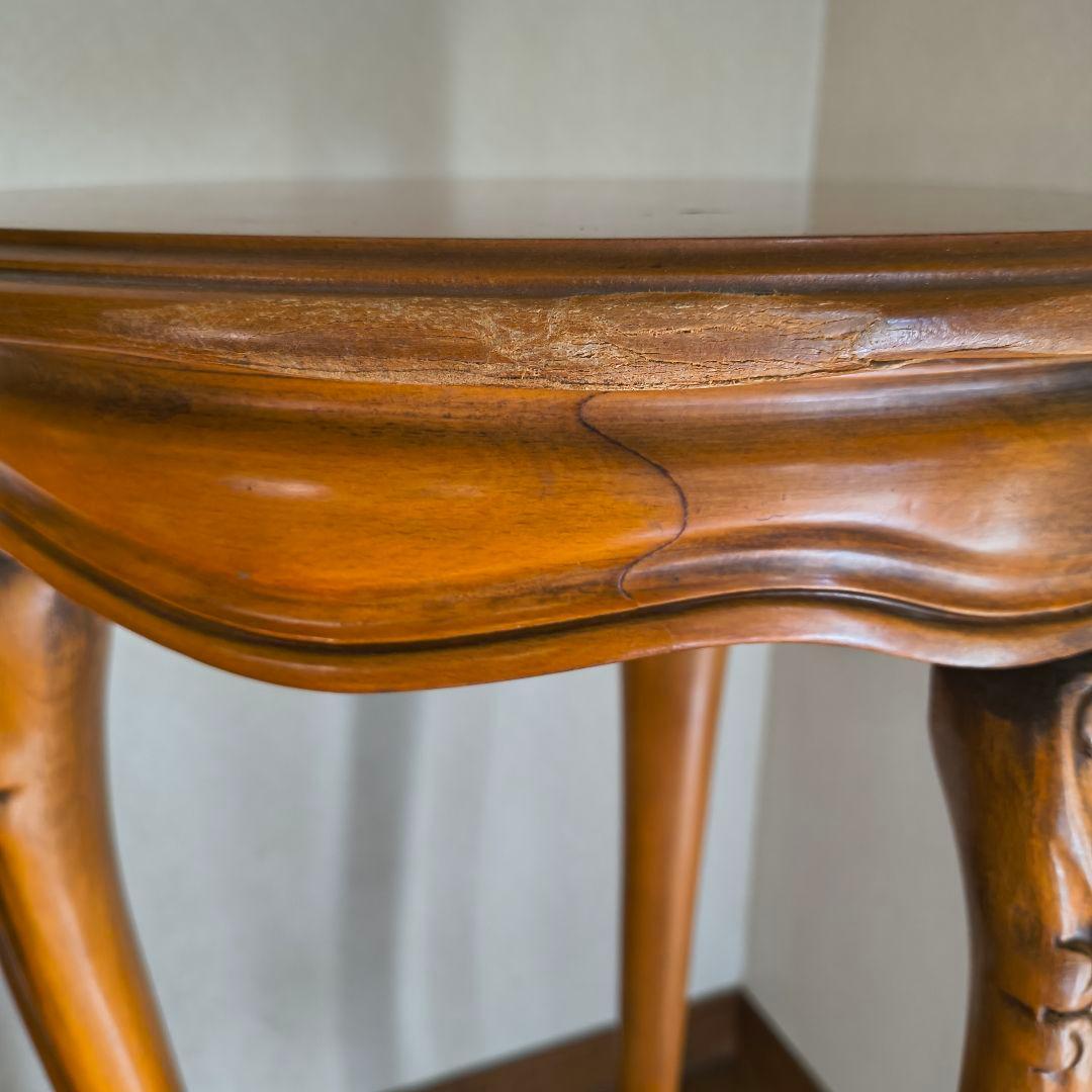 装飾的な脚部と円形天板の木製サイドテーブル。
