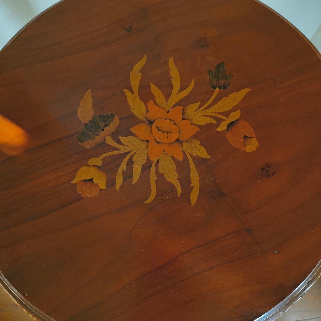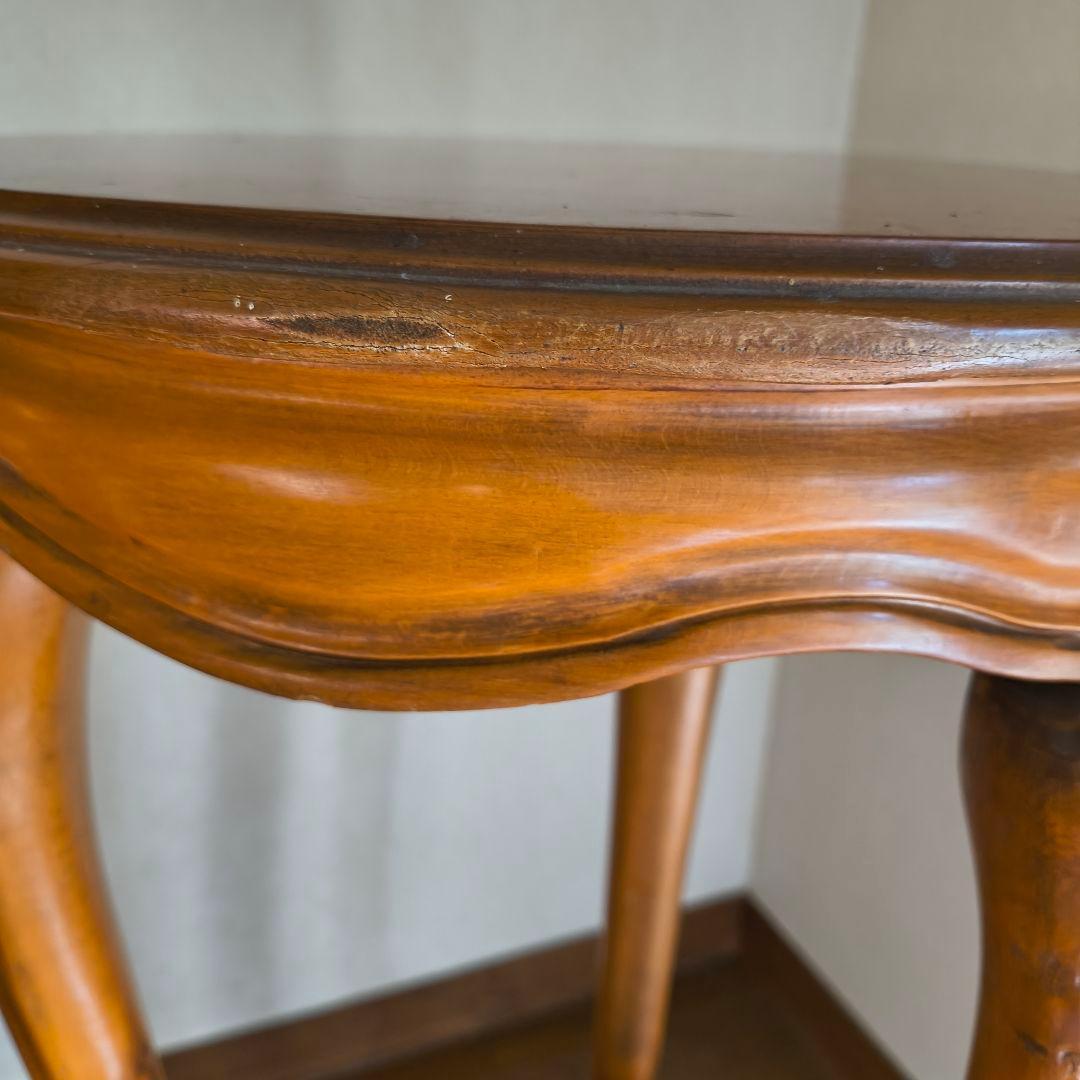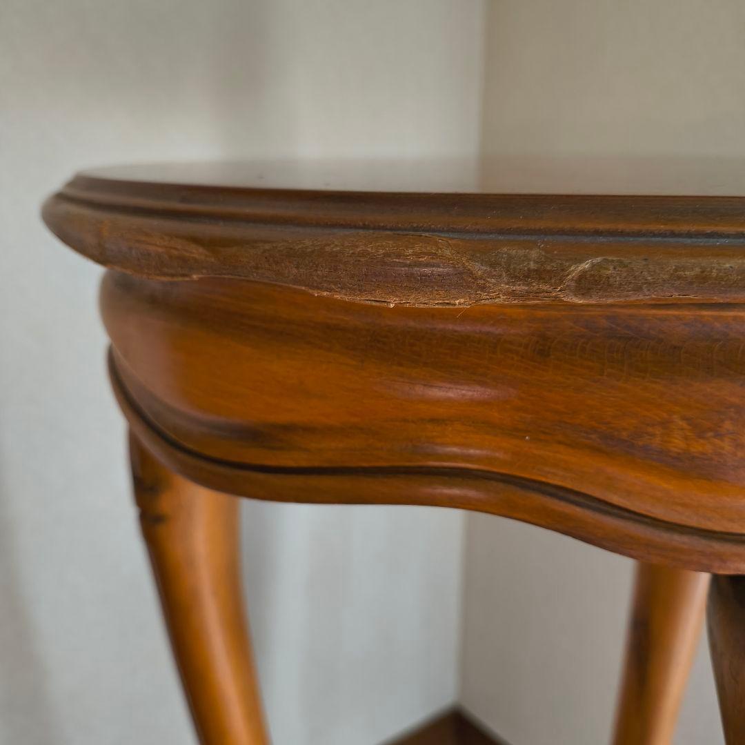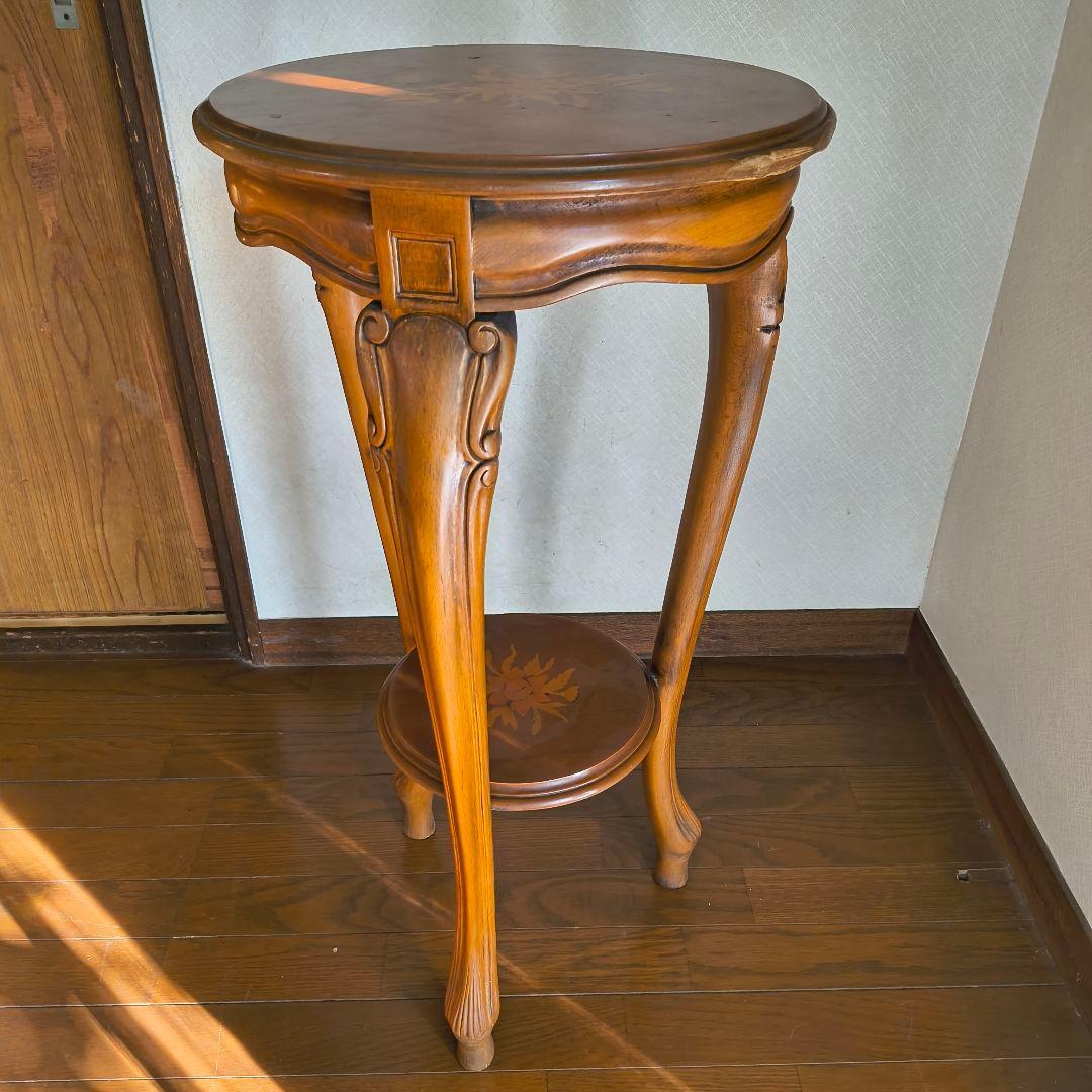 装飾的な脚部と円形天板の木製サイドテーブル。