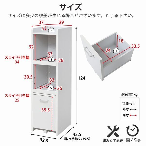 【カラー】 ホワイト、ホワイト×ダークブラウン 【サイズ】 <外寸> 幅32.5×奥行42.5×高さ124cm <内寸> スライド部1段目:幅26×奥行33×高さ32cm スライド引き幅1段目:34cm スライド部2段目:幅26×奥行33×高さ30.5cm スライド引き幅2段目:25cm 引き出し:幅24×奥行33.5×高さ18(有効35.5)cm 【材質】 本体:プリント紙化粧合板 天板・前板・スライド棚:合成樹脂化粧合板(PVC) 【耐荷重】 天板:(約)5kg以下 スライド棚:各(約)5kg以下 引き出し:(約)7kg以下 【生産国】 中国 【梱包】 サイズ:75.5×43.5×23cm、重量:21kg 【その他】 ・背面化粧有り ・キャスター1個 ・合計1500wの2口コンセント付き(コード長さ194cm) 【組み立て品】 お客様による組み立てが必要です。 【ご注意】 ・サイズ、重量は概算です。 ・商品カラーはご使用のモニターによって実際の明るさや色と異なって見える場合がございます。 |