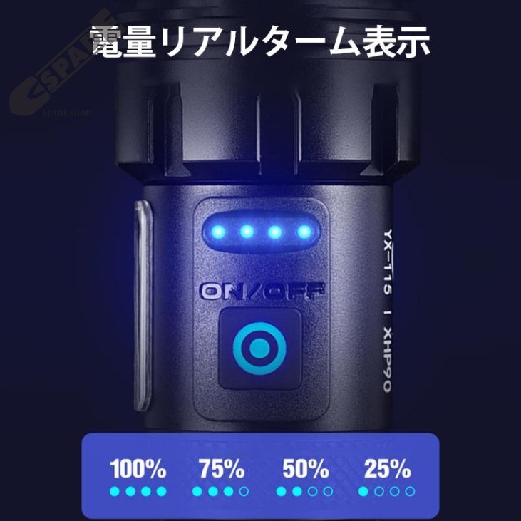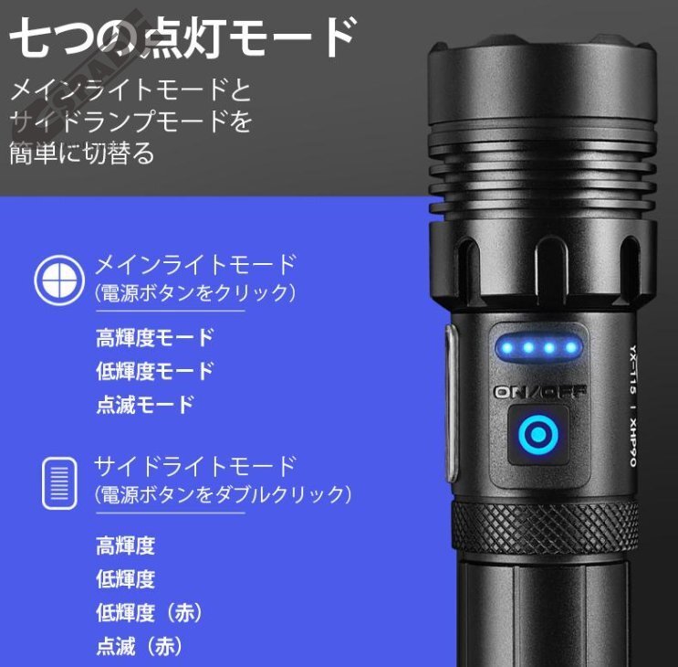 商品説明探検や非常時に欠かせない、高性能なLED懐中電灯をご紹介します。この懐中電灯は、驚異の9500ルーメンの超高輝度で、暗闇を明るく照らし出します。小型でありながら、そのパワフルな照明能力は、夜釣り、登山、キャンプなどのアウトドア活動に最適です。また、防災用具としてもその性能を発揮し、地震や停電時の安全確保に役立ちます。