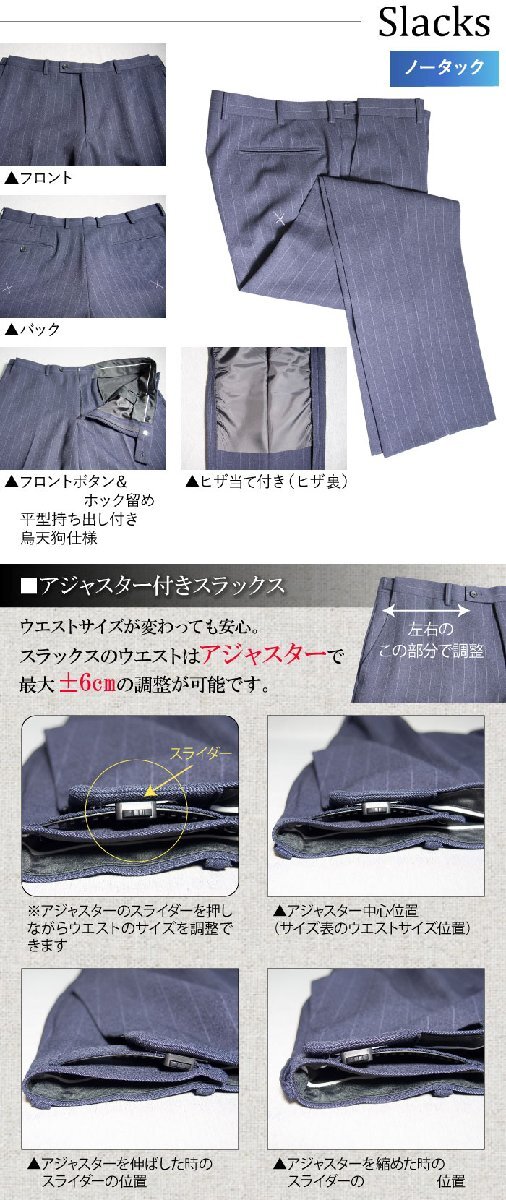 | スラックス | ノータック 股上浅め ボタン&ホック留め 平型持ち出し付き 烏天狗仕様 ウエストアジャスター付き(±約6cm) ヒザ当て付き |