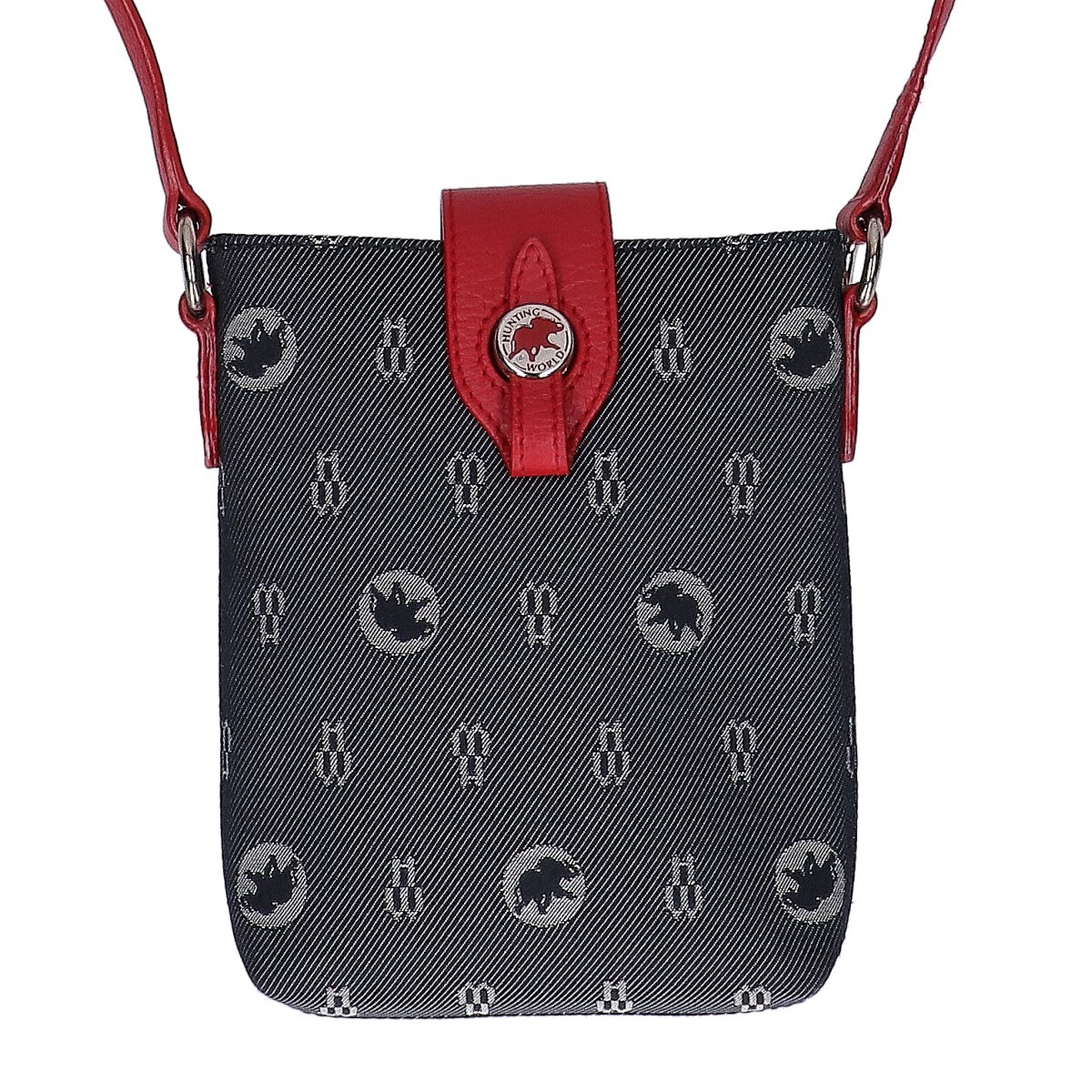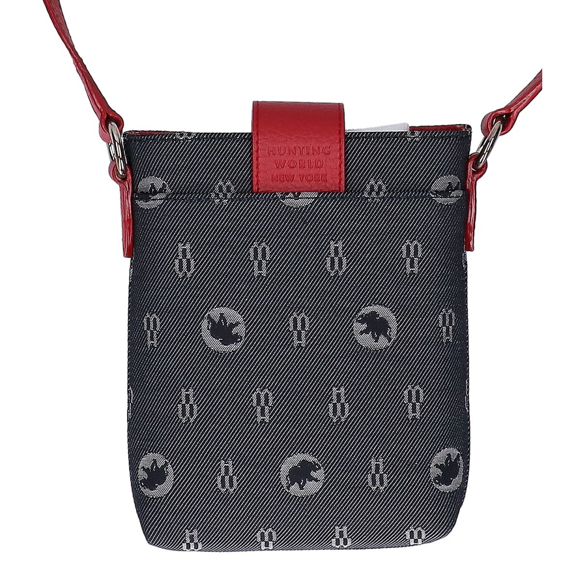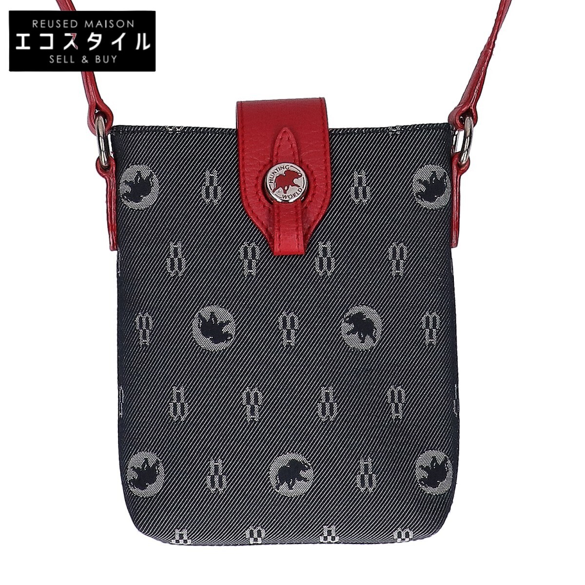 美品/ HUNTING WORLD ハンティングワールド 総ロゴ キャンバスxレザー ショルダーバッグ ブラック/レッド レディース