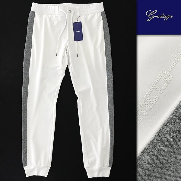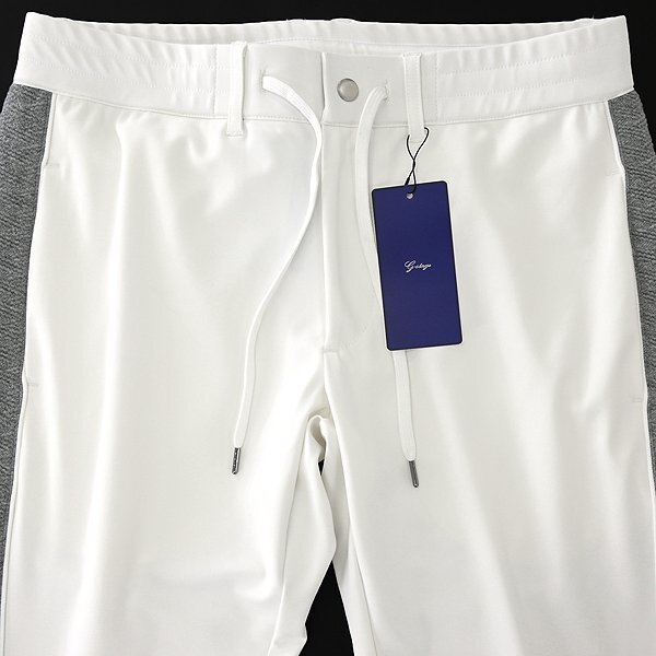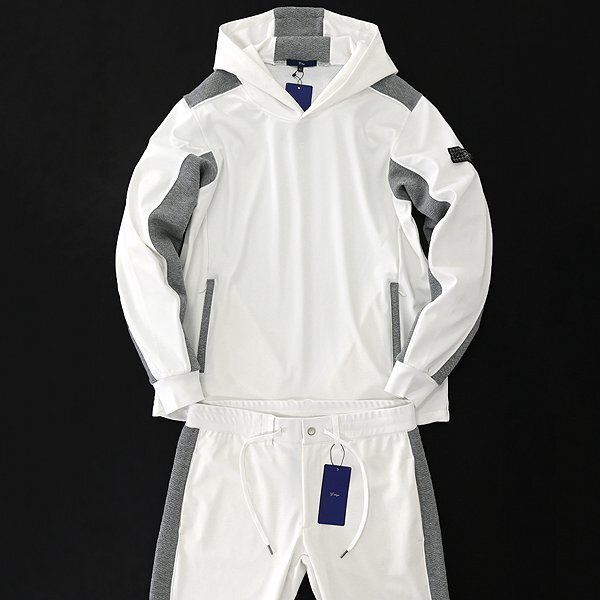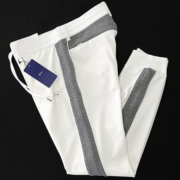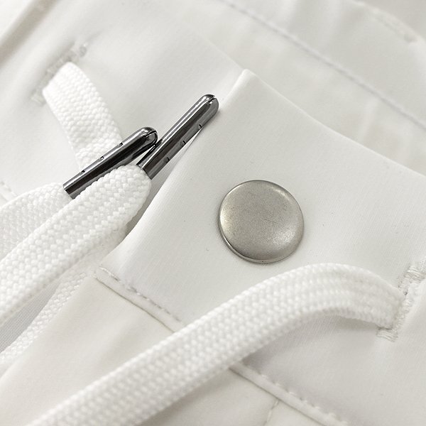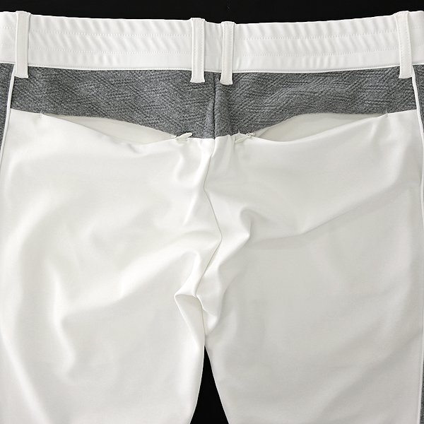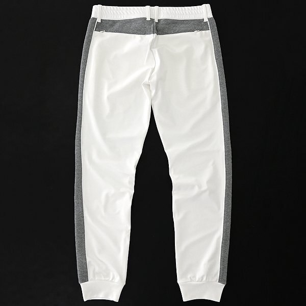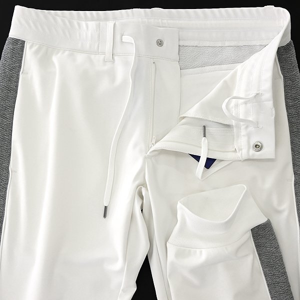 | 新品 未使用 紙タグあり ※商品画像のセットアップパーカーは別売りです※ 48サイズ(Lサイズ相当) ウエスト86 ※商品に記載されたサイズ・寸法です※ ウエスト実寸84~94cm(内回り1周・ゴム入り) 股上25cm 股下76cm 裾幅12.5cm(リブ使用) 腿幅28.5cm(股下10cm部分) ※伸縮性がある素材のため多少誤差が生じることがあります※ 表地表側:ナイロン72% ポリウレタン28% 表地裏側:ポリエステル100% 別布:ポリエステル54% 綿44% ポリウレタン2% リブ:ポリエステル100% ホワイト×グレー |