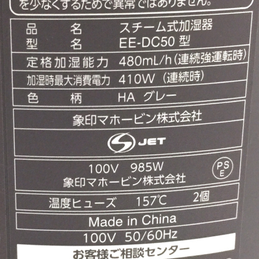 | ZOUJIRUSHI EE-DC50 スチーム式 加湿器 4.0L 適用畳数13畳 グレー 2022年製 |