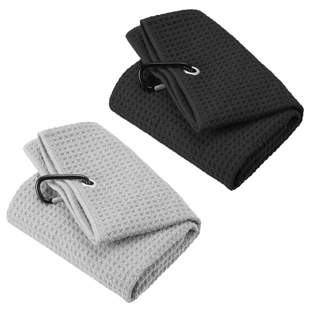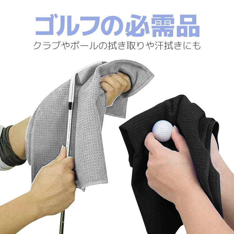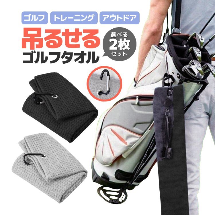 ◆吊るせる ゴルフタオル 選べる2枚セット カラビナフック付き ブラック/グレー 40cm×60cm マイクロファイバー ワッフル生地 アウトドア/スポーツジム/釣り/ペット/スキー/海水浴/スポーツ観戦にも【ブラック1枚グレー1枚】GT4060S2
