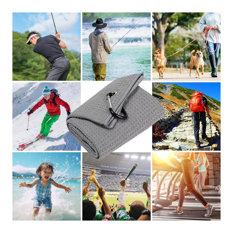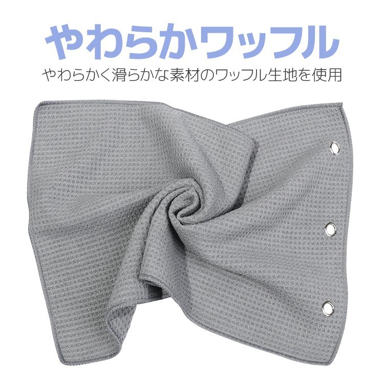 ゴルフプレー中に役立つカラビナフック付きのゴルフタオルです。