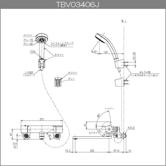 壁付サーモスタット混合栓 サーモシャワー コンフォートウェーブ 吐水パイプ 220mm TBV03406J1 TOTO GGシリーズ