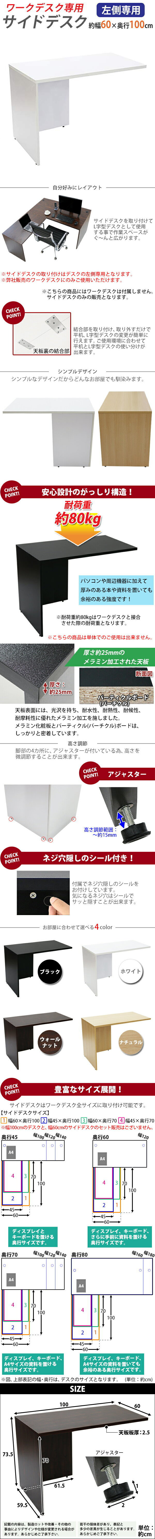 | 商品紹介 | ■弊社販売のワークデスクにのみご使用いただけます。 (こちらの商品は、弊社販売のワークデスクworkdesk,desk07,desk11にのみ使用可能です。) ■作業スペースを広く確保出来る、ワークデスク専用のサイドデスクです。 ■幅が約60cmのタイプです。 ■付属のプレートでワークデスクとサイドデスクを固定するだけの簡単接合。 ■会議室や事務所等、オフィス家具として様々なシーンでお使いいただけます。 ■天板には、メラミン加工を施しています。 ■天板裏の結合金具、ネジ穴隠しのシール付き。 ■アジャスターで高さの調節が可能です。(高さ調節範囲〜約15mm) ※こちらの商品は、組立て式です。組立てにはプラスドライバーが必要です。お客様でご用意ください。 ※組立図が付属します。 ※サイドデスクの取り付けはデスクの左側専用となります。 ■材質:パーティクル(パーチクル)ボード(メラミン加工)(本体)、プラスチック(アジャスター) ■重量:約21kg ■耐荷重:約80kg(ワークデスク接合時) ●新品商品ではありますが、輸入商品の為、多少の擦り傷などがある場合がございますので、ご納得の上ご購入下さいませ。 ●ご購入後、お客様ご都合によるご返品、ご返金等は一切お受け致しておりません。 ●本商品を使用した際に発生したトラブル、事故につきまして、当社は一切の責任を負いません。ご使用に関しましては、全て自己責任にてお願い致します。 ※カラーはホワイトとなります。 |