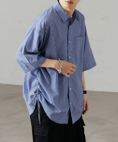 キーワード:シャツ メンズ ストライプ レギュラーカラー ロング丈 七分袖 五分袖