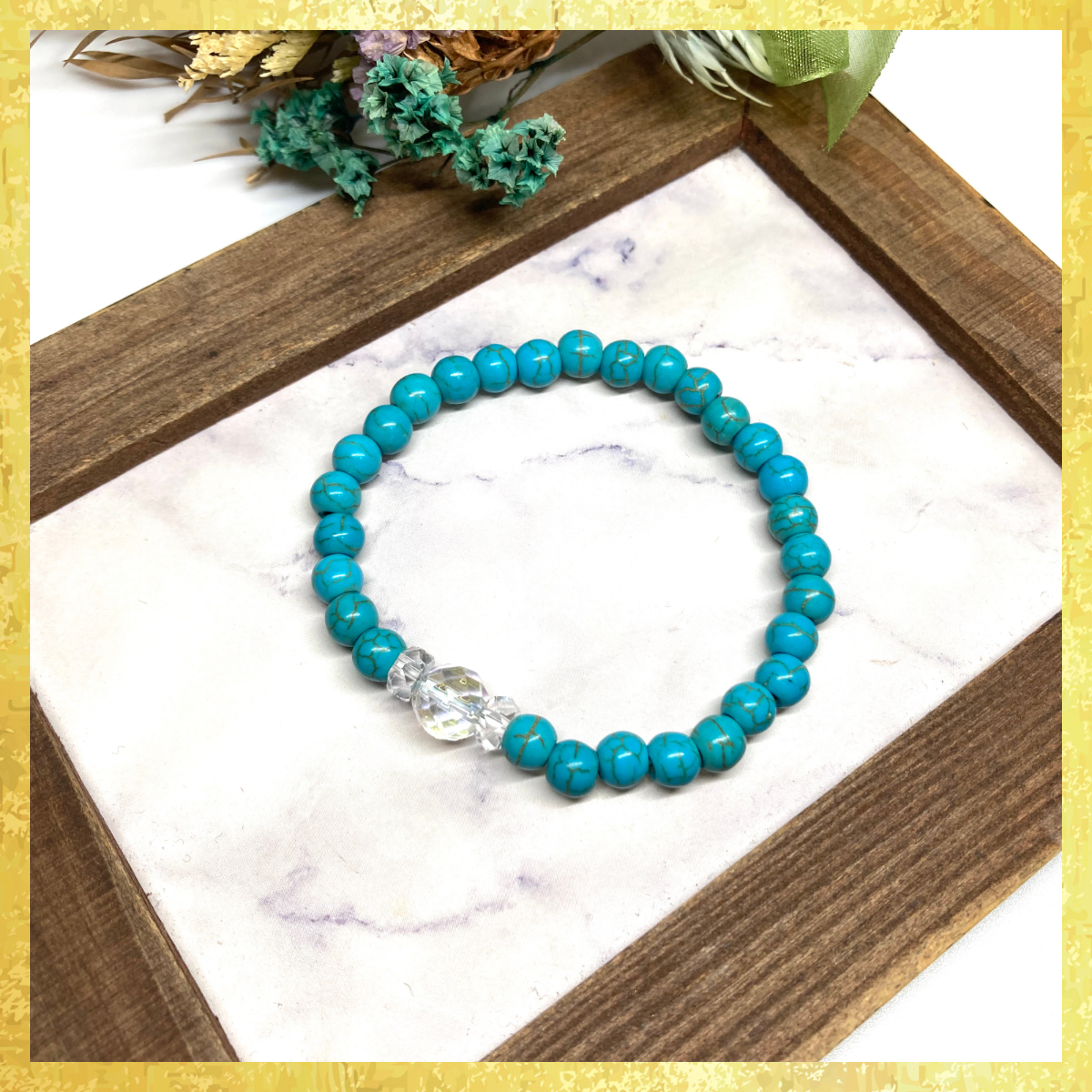 こちらは、64面水晶とターコイズを組み合わせた一粒ブレスレットです。今回はお買い得プライスにて販売しておりますので是非この機会にどうぞ。(お買い得プライスは予告なく終了する場合がありますのでお早めに!!) 石大きさ8mmと6mm玉で基本サイズは内周15cmです。(サイズ変更は1cmあたり100円で承っております。サイズ変更の場合は金額変更しますのでご連絡くださいませ。)