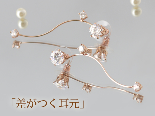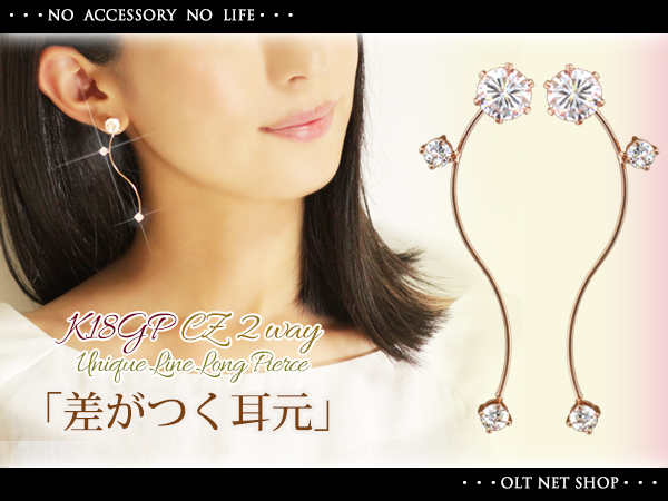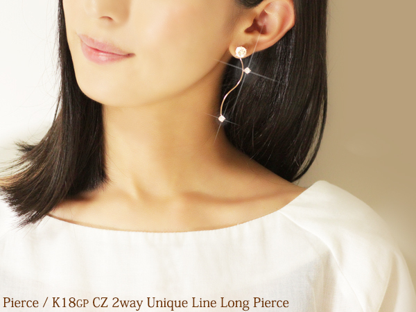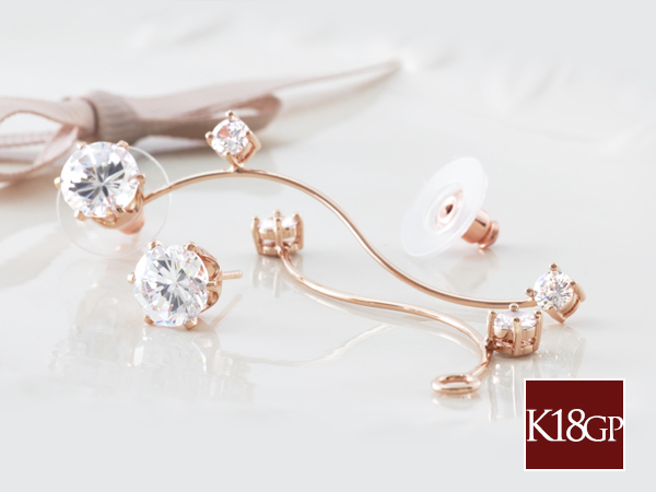 新品/ピアス/K18GP/ロング/ダイヤ/18金/ピンクゴールド/レディース/両耳/スタッド/2way/一粒/CZ/大粒/シンプル/上品/女性/PG