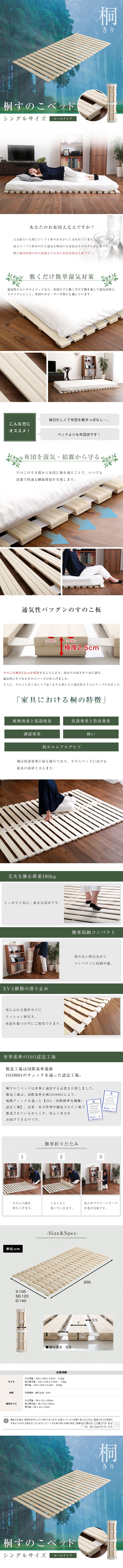 | 【ポイント】 通気性バツグンのすのこベッドです。 材質はすのこベッドにおける最良の桐材を使用しました。 頑丈な耐荷重180kgです。 |