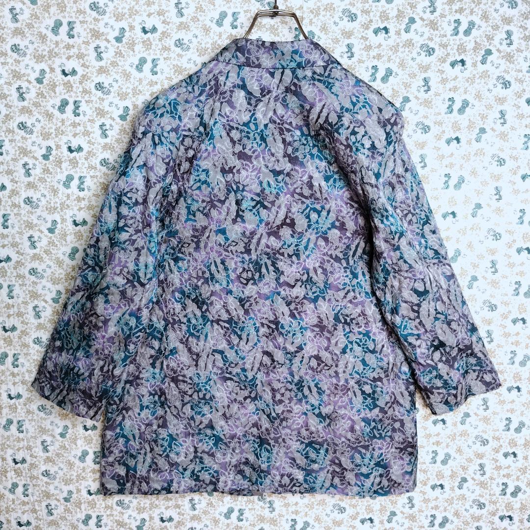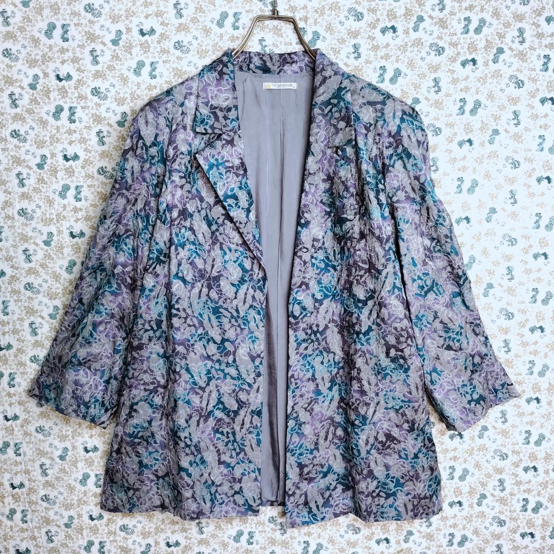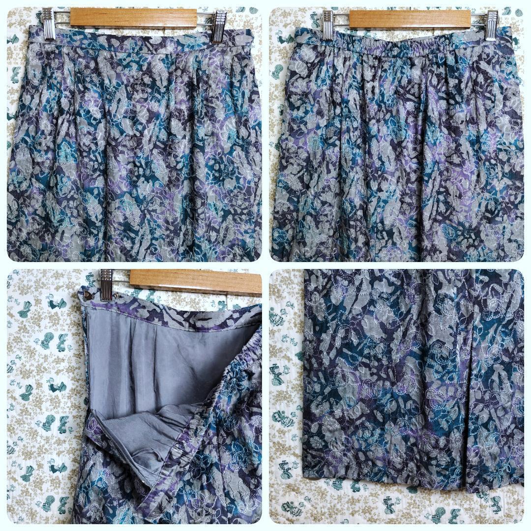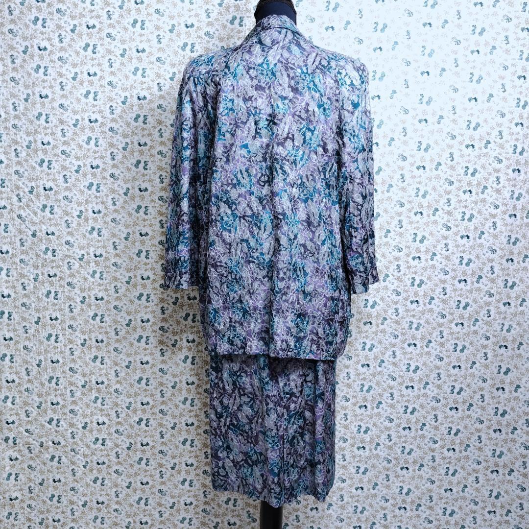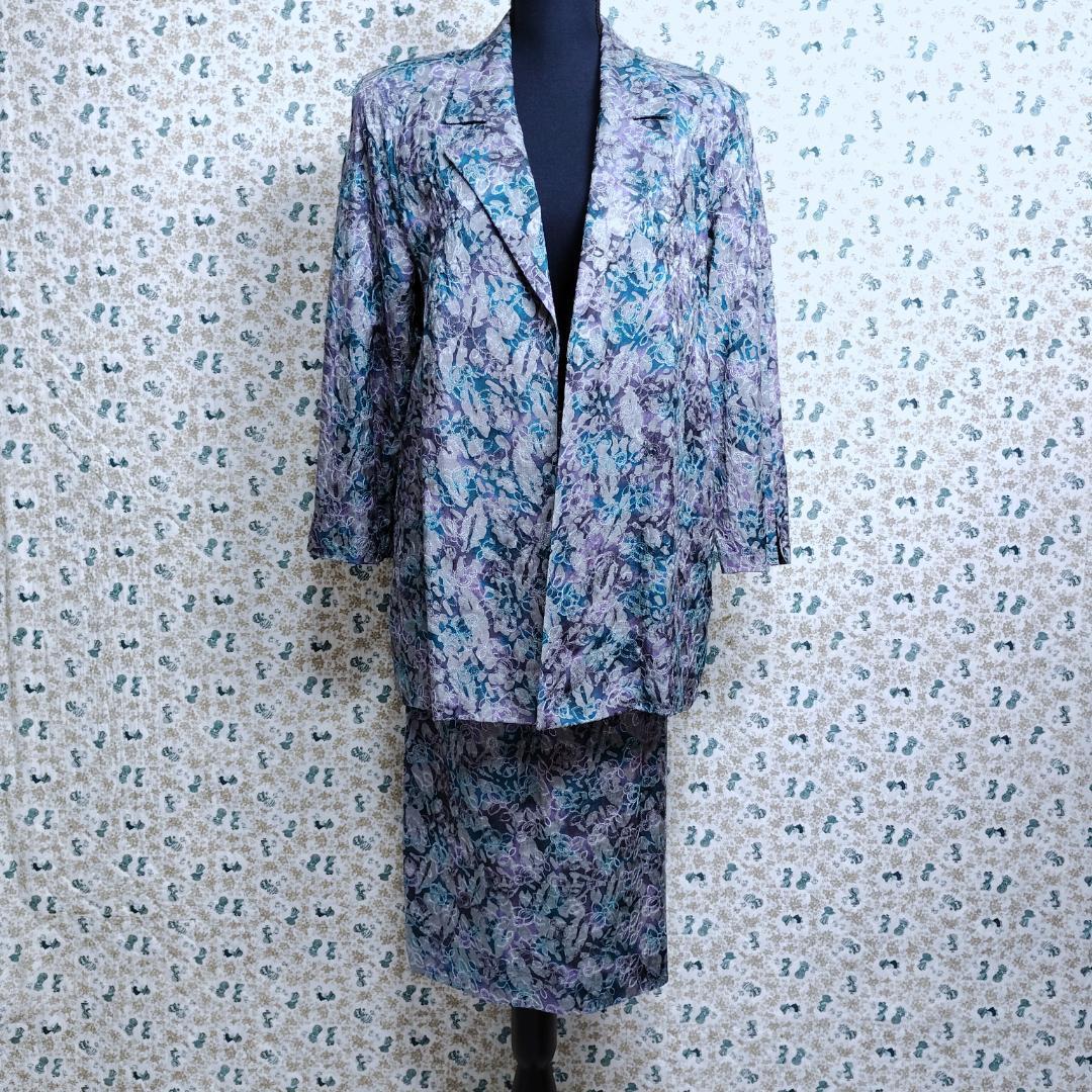 スカートスーツ☆セットアップ 上下 ボタニカル フラワー 花 刺繍 総柄 高級 大きいサイズ 薄手 グレー ブルー青 パープル紫 LかXL相当