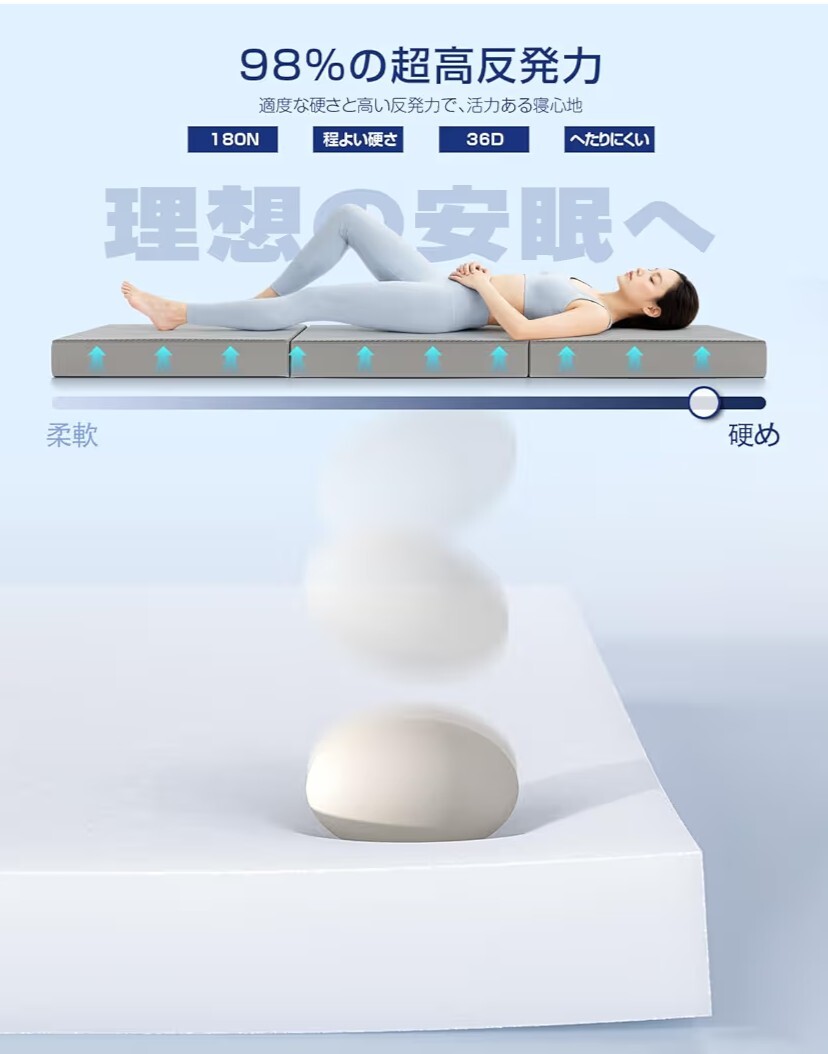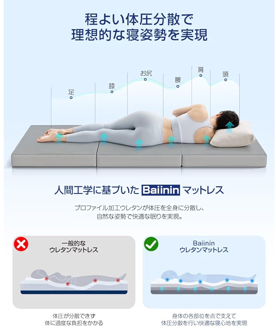 98%の超高反発力を持つBaininマットレスで、理想的な寝姿勢を実現。