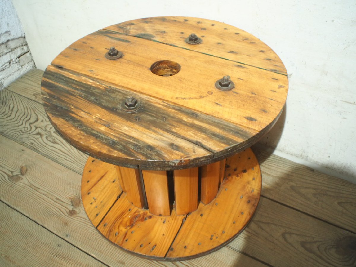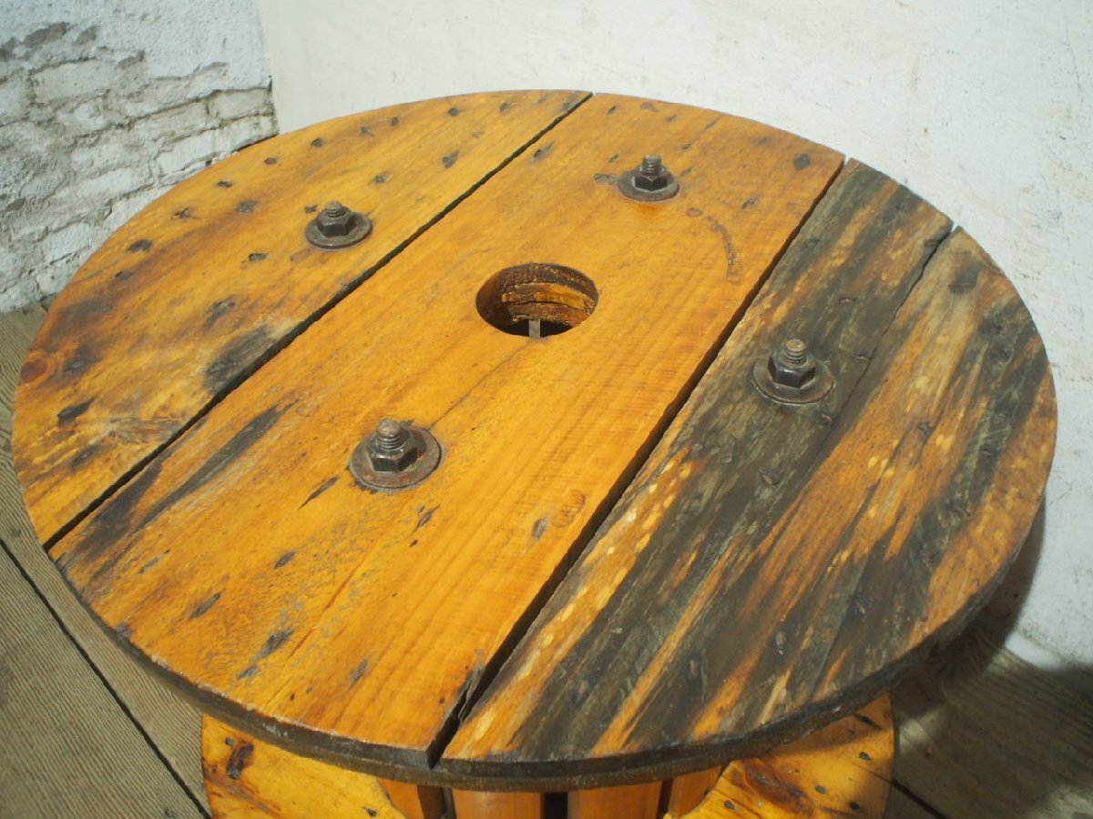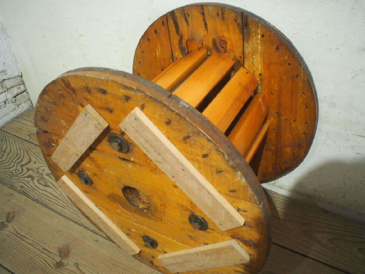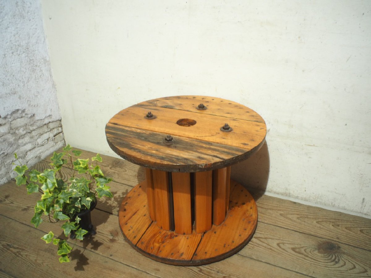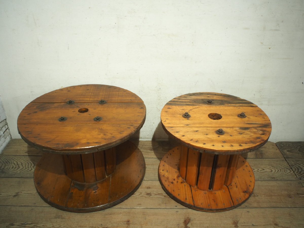タJ0977◆②直径55cm◆ヴィンテージ◆レトロなドラムの古い木製センターテーブル◆工業系 陳列台 ガーデン コーヒー カフェ 店舗什器K笹4